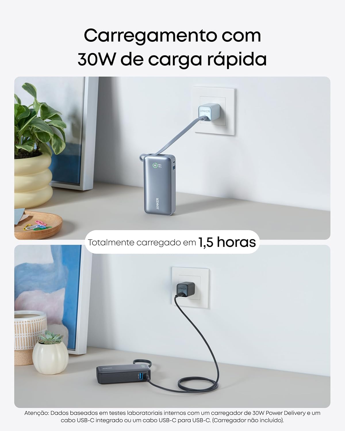 Anker Nano Power Bank, Carregador Portátil de 10.000 mAh com Cabo USB-C Integrado, Saída Máxima de 30W, para iPhone 17/iPhone 16/Série 15, MacBook, AirPods e Mais, Branco