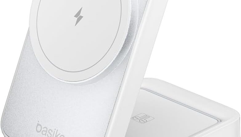 Basike Carregador Sem Fio 3 em 1 Magnético 2025, Estação de Carregamento Portátil com Luz Noturna, Dobrável e Compatível com MagSafe, iPhone 16/15/14/13/12, Apple Watch e AirPod (Branco)