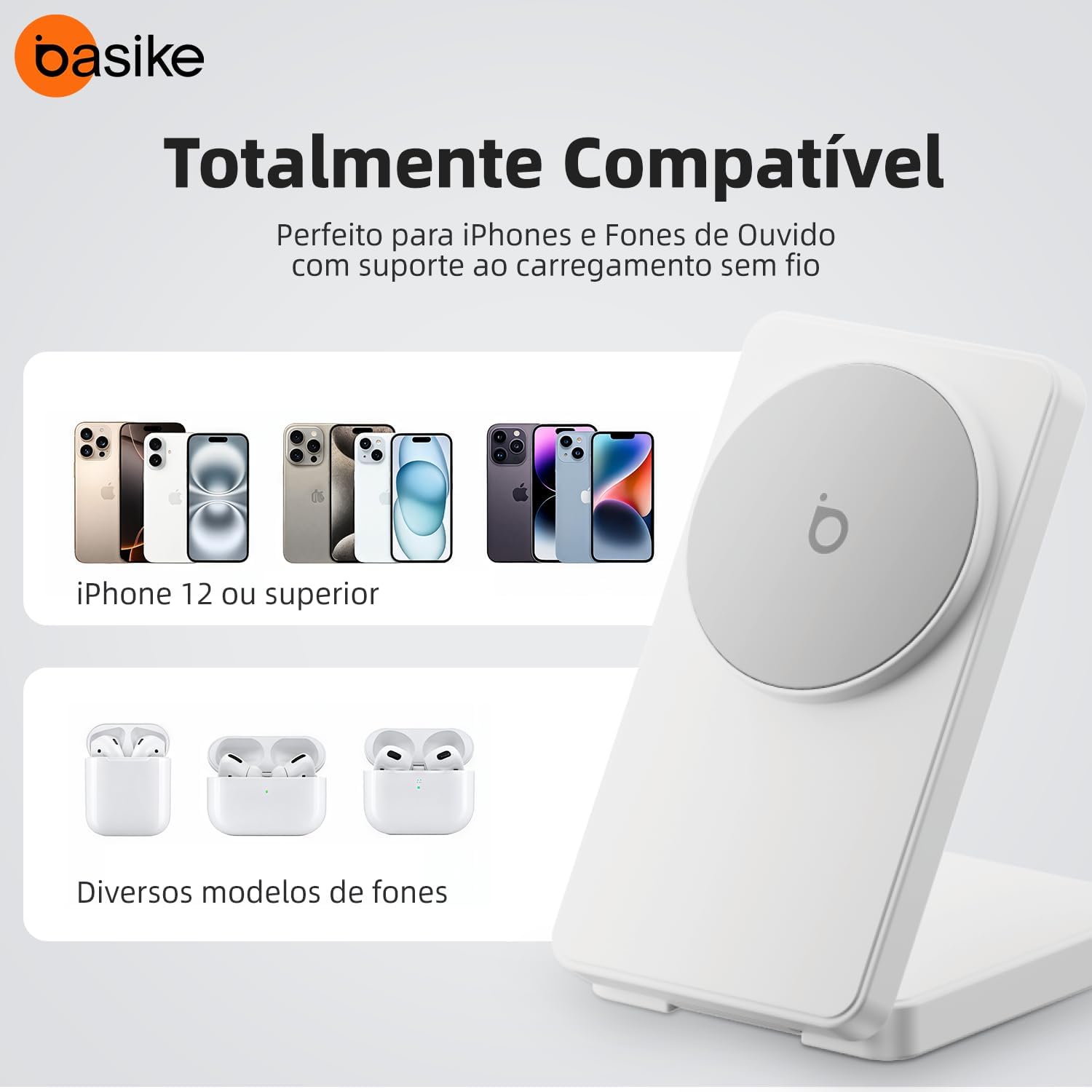 Basike Carregador Sem Fio, Carregador por Indução 15W Compatível para iPhone 16/15/14/13/12 Series e AirPods | Carregamento Rápido com Magnétic | Compatível com Qi (Branco)
