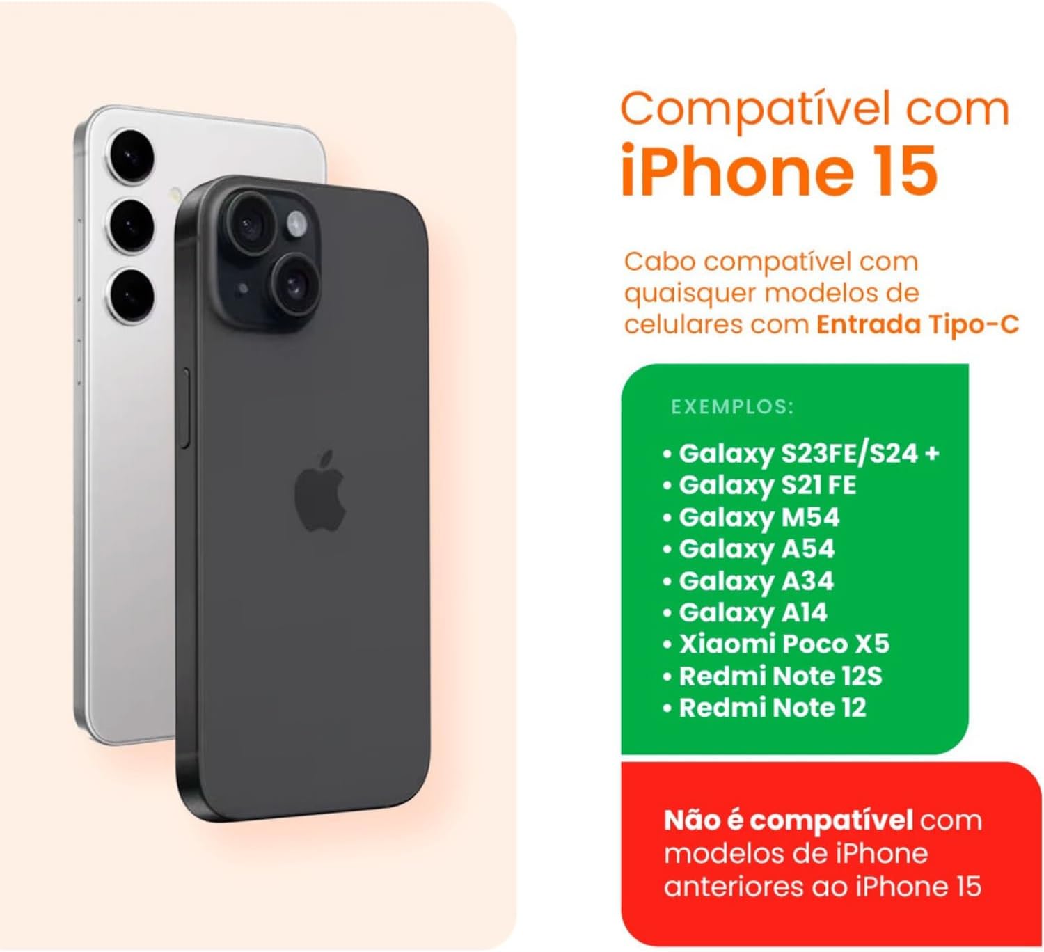 ✅ Compatibilidade Universal: Compatível com uma ampla variedade de dispositivos USB-C, incluindo smartphones Android (Samsung Galaxy A54, A34, A14, M54, S23FE/S24+, S21 FE; Xiaomi Poco X5, Redmi Note 12S, Redmi Note 12) e os iPhones mais recentes. iPhones anteriores ao iPhone 15 não são compatíveis.