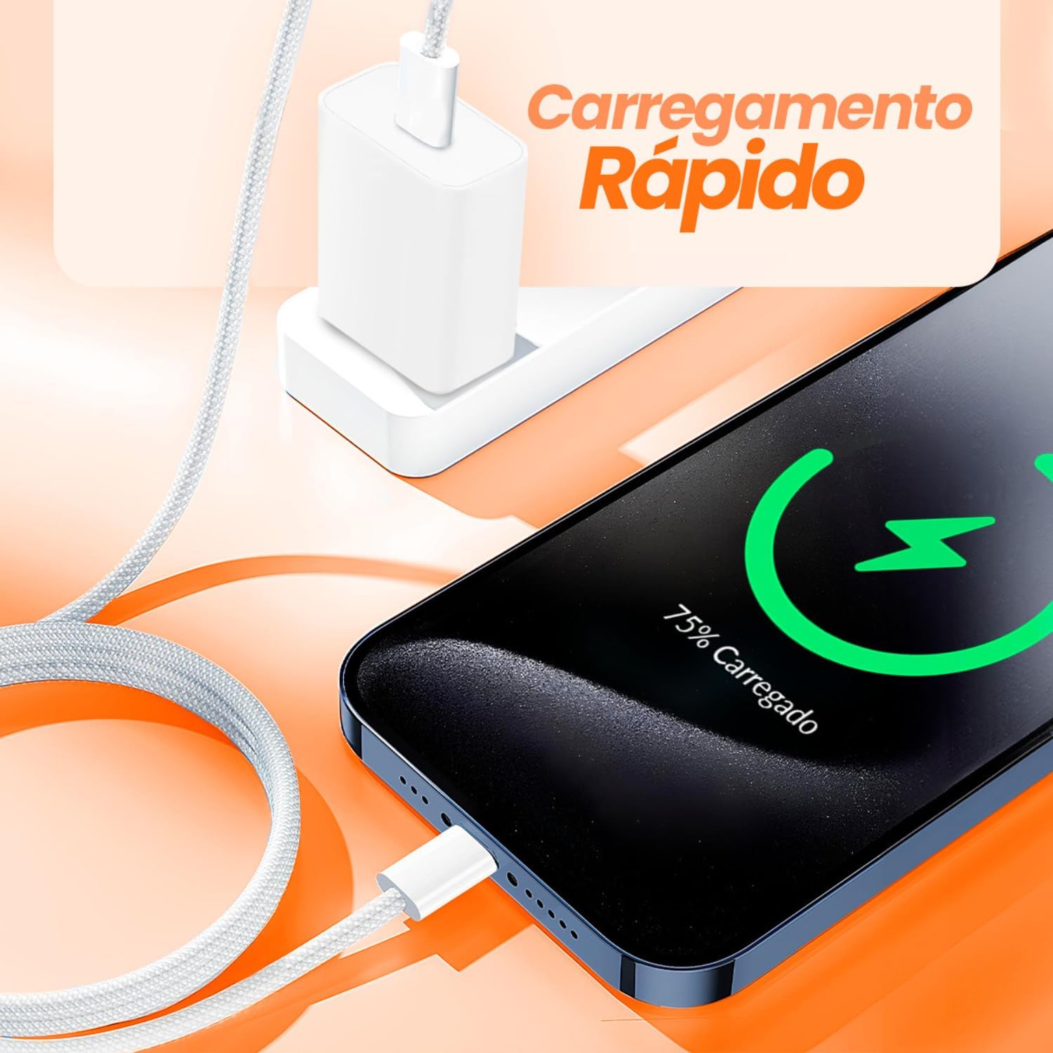 - A trança de nylon reforçada proporciona proteção extra contra desgaste, torções e dobras, assegurando a integridade do cabo por muito mais tempo.