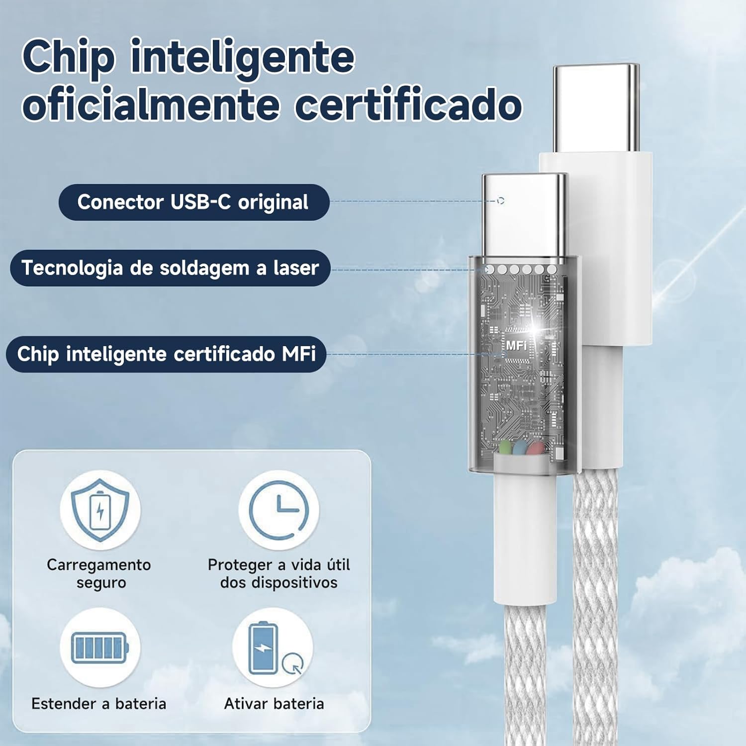 Proteja seu iPhone 16 e outros gadgets com núcleos de cobre puro e um chip inteligente integrado. Este cabo iPhone tipo C possui proteção contra superaquecimento, sobrecarga e curtos-circuitos, garantindo carregamento seguro mesmo durante a noite. Compatível com: