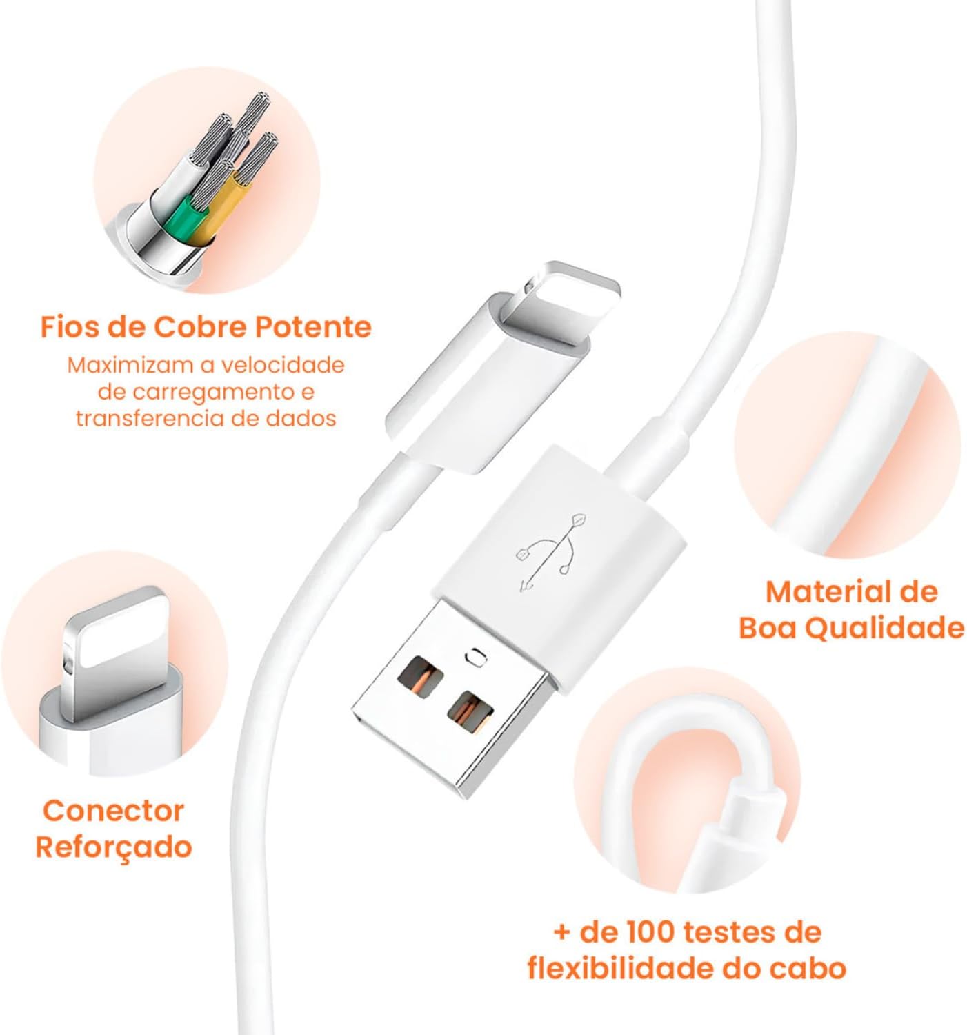 - iPhones Compatíveis: Este cabo suporta todos os modelos de iPhone desde o 6 ao 14 Pro Max, incluindo o iPhone SE (2ª geração), oferecendo a flexibilidade necessária para conectar dispositivos de todas as gerações.