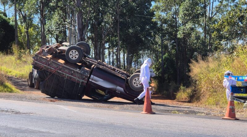 Motorista e passageiro estavam com trajes especiais e não se feriram. Bombeiros foram acionados para avaliar descarte dos insetos. Caminhonete capotou com 40 caixas de abelhas