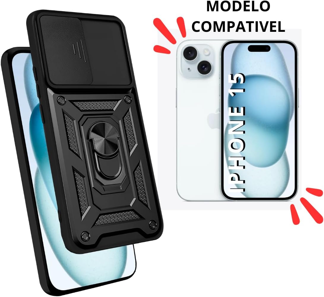 Capa Capinha Armor Anti Impacto Ring Luxo Para iphone 15 (Tela 6.1) + Anel Giratorio + Proteção De Câmera – Proteção Militar