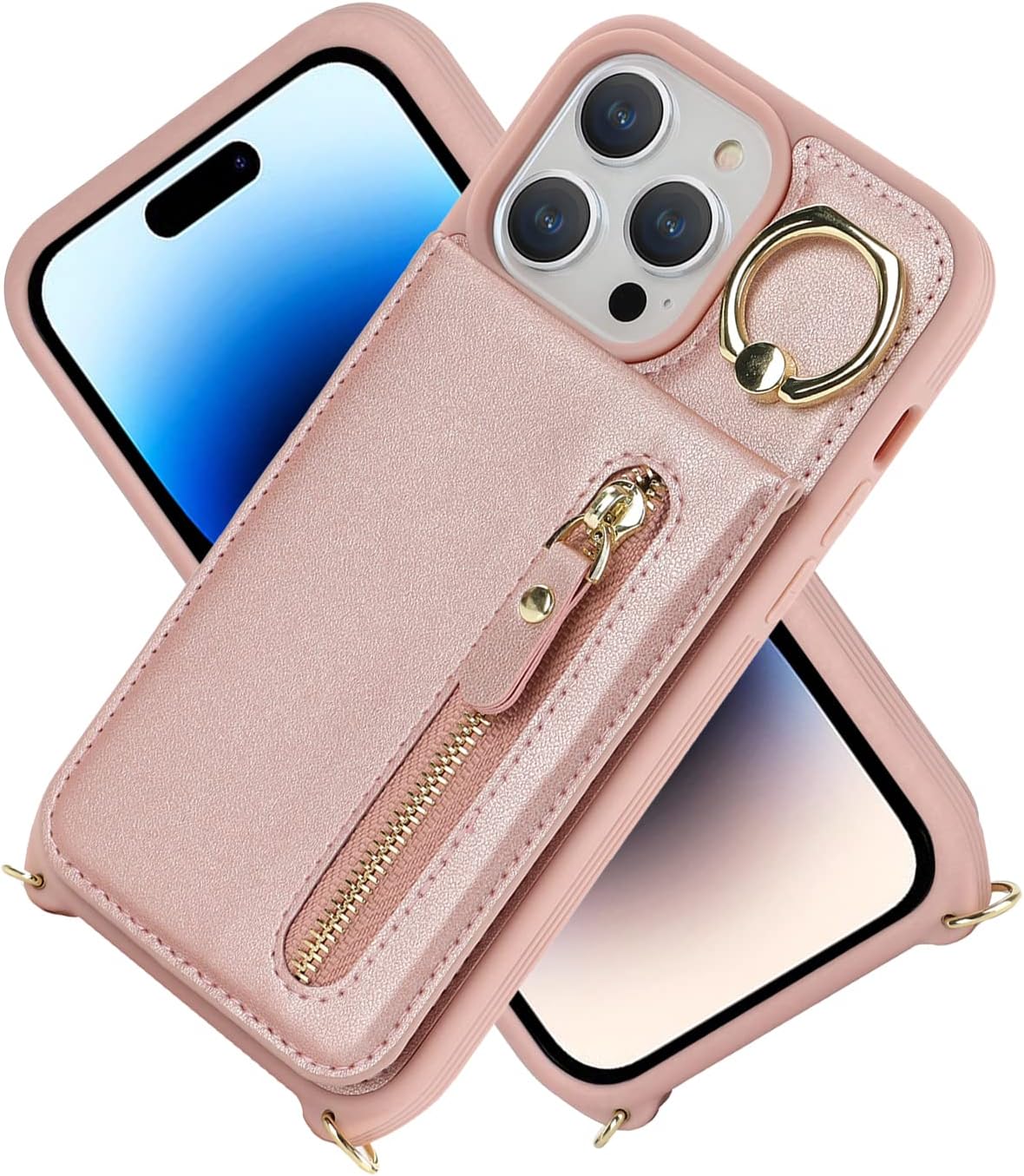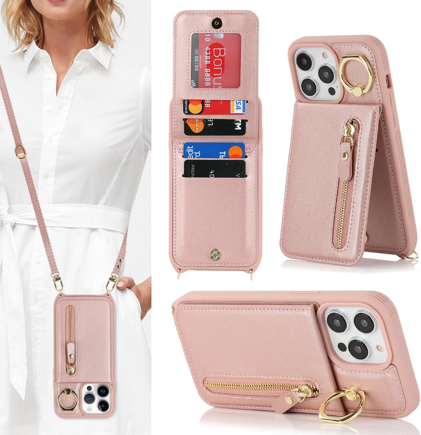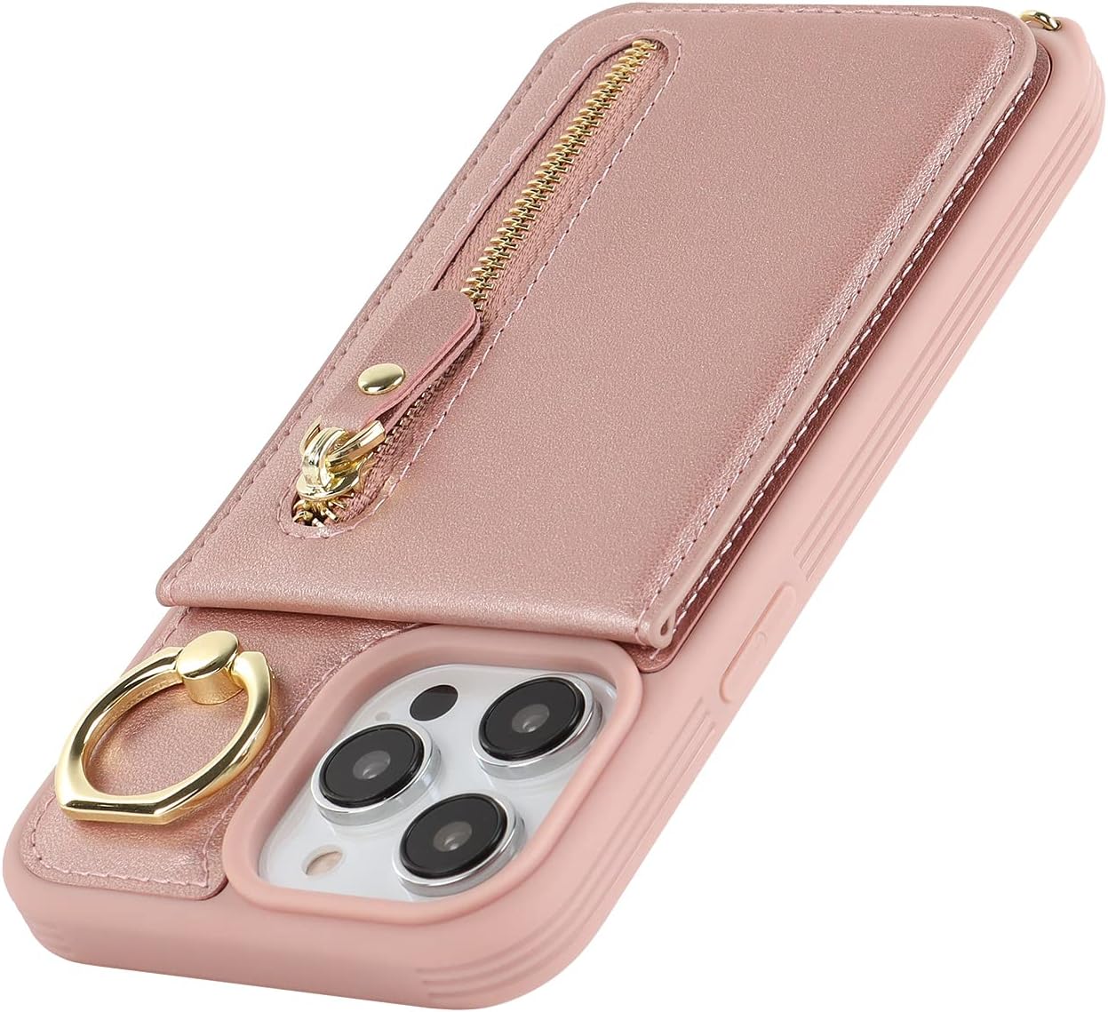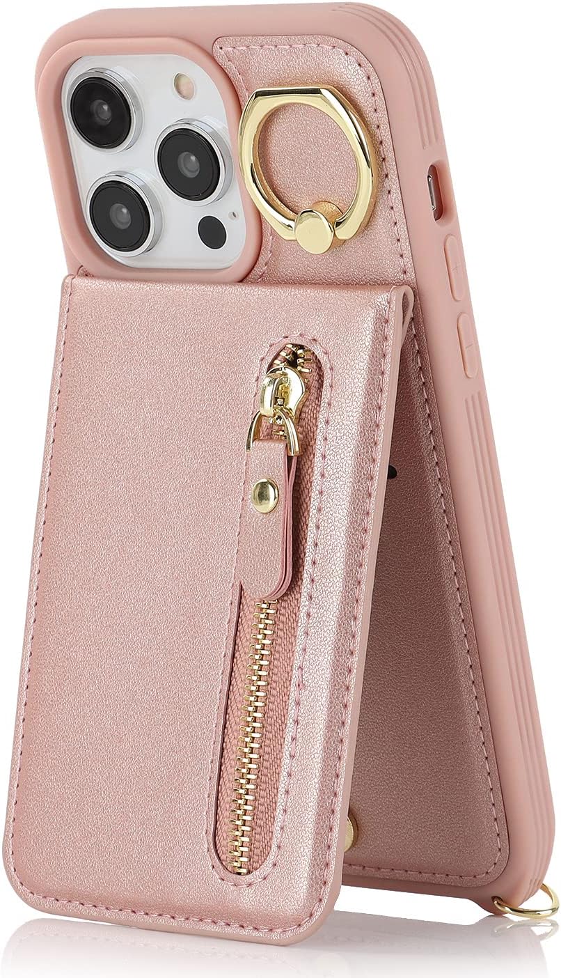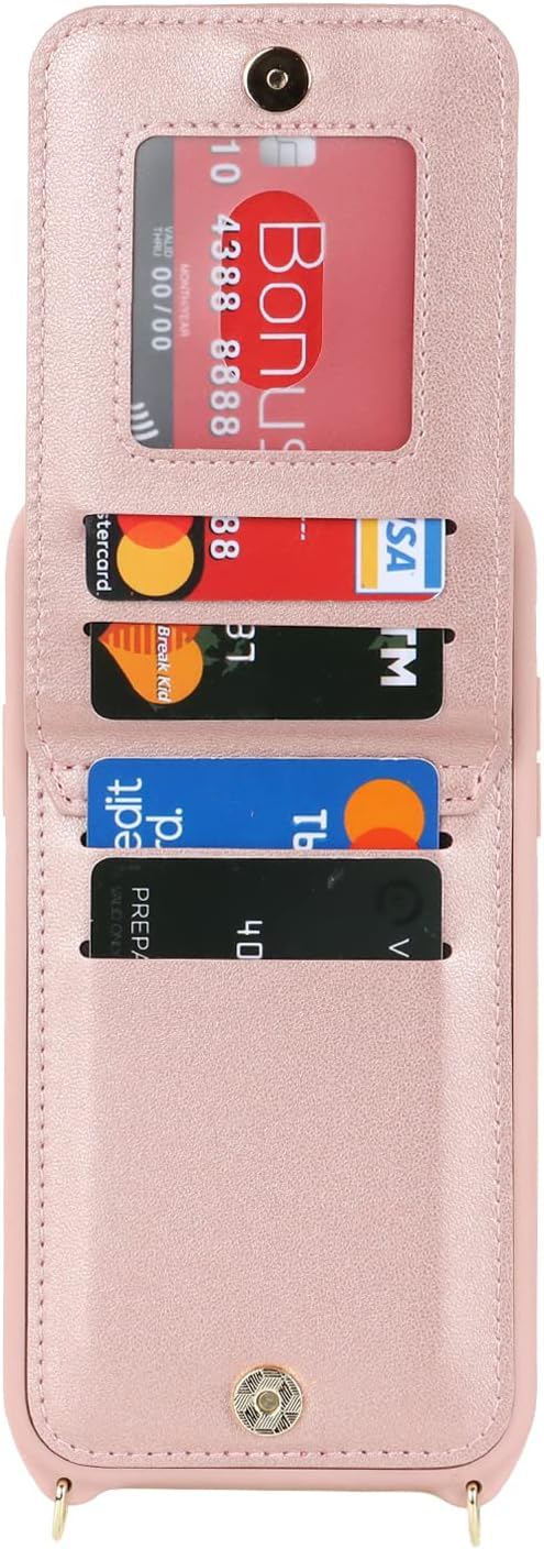 Capa carteira para iPhone 14 Pro Max com suporte para cartão e suporte, 4 compartimentos, capa de couro sintético à prova de choque para mulheres – A + ouro rosa