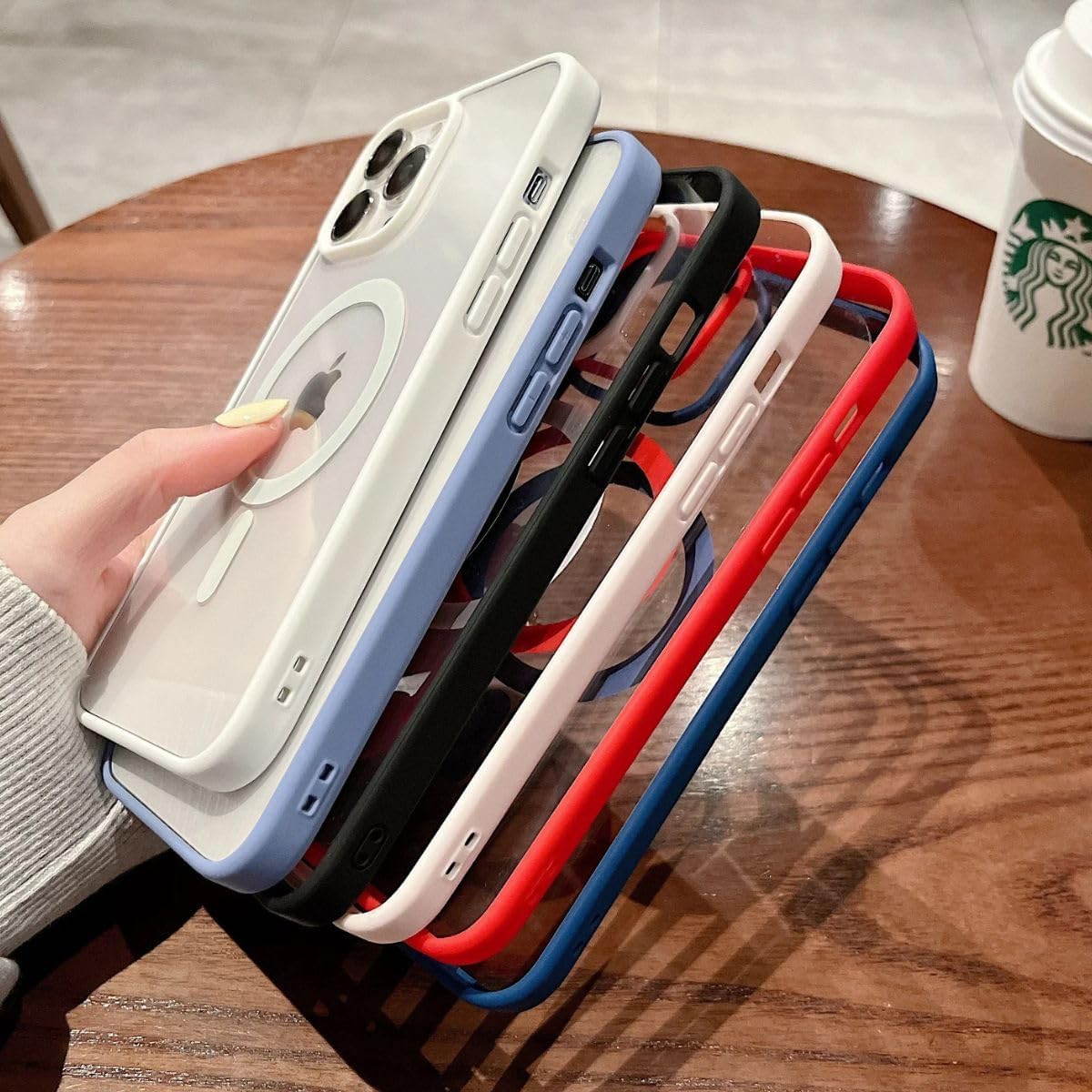 Case Capa Para Iphone Transparente e Colorida. Fina leve e fácil de segurar esta capa oferece mais proteção sem esconder o brilho das cores do seu iPhone, feita de uma combinação de policarbonato transparente e materiais flexíveis ela se encaixa perfeitamente sobre os botões facilitando o uso. Um revestimento resistente a arranhões foi aplicado a superfície tanto na parte externa quanto na interna e todas as materiais e coberturas são tratados para não amarelar em com o tempo com imãs integrados que se aliam com perfeição ao seu iPhone, ela oferece recarga sem fio mais rápido e encaixe fácil que parece mágica e você pode manter a capa do seu iPhone o tempo todo mesmo durante a recarga no carregador por indução. Escolha a cor que combina com seu iPhone 15.