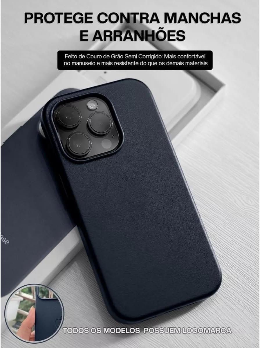- Material Premium: Feita em couro legítimo de alta qualidade, proporcionando um toque macio e agradável ao segurar seu iPhone. Um material que alia durabilidade e conforto.