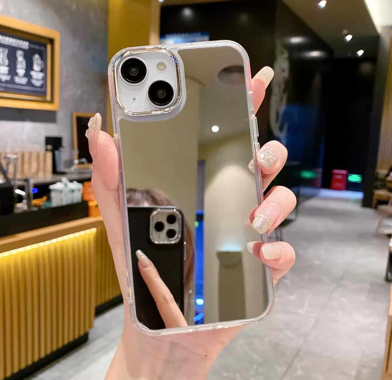 capa espelhada de proteção, design premium e elegante, espelho traseiro de alta qualidade, suporte dobrável para chamadas de vídeo, proteção contra riscos e impactos, bordas reforçadas para maior segurança, acabamento sofisticado em prata, fácil acesso a botões e entradas, instalação prática e rápida, compatível com iPhone