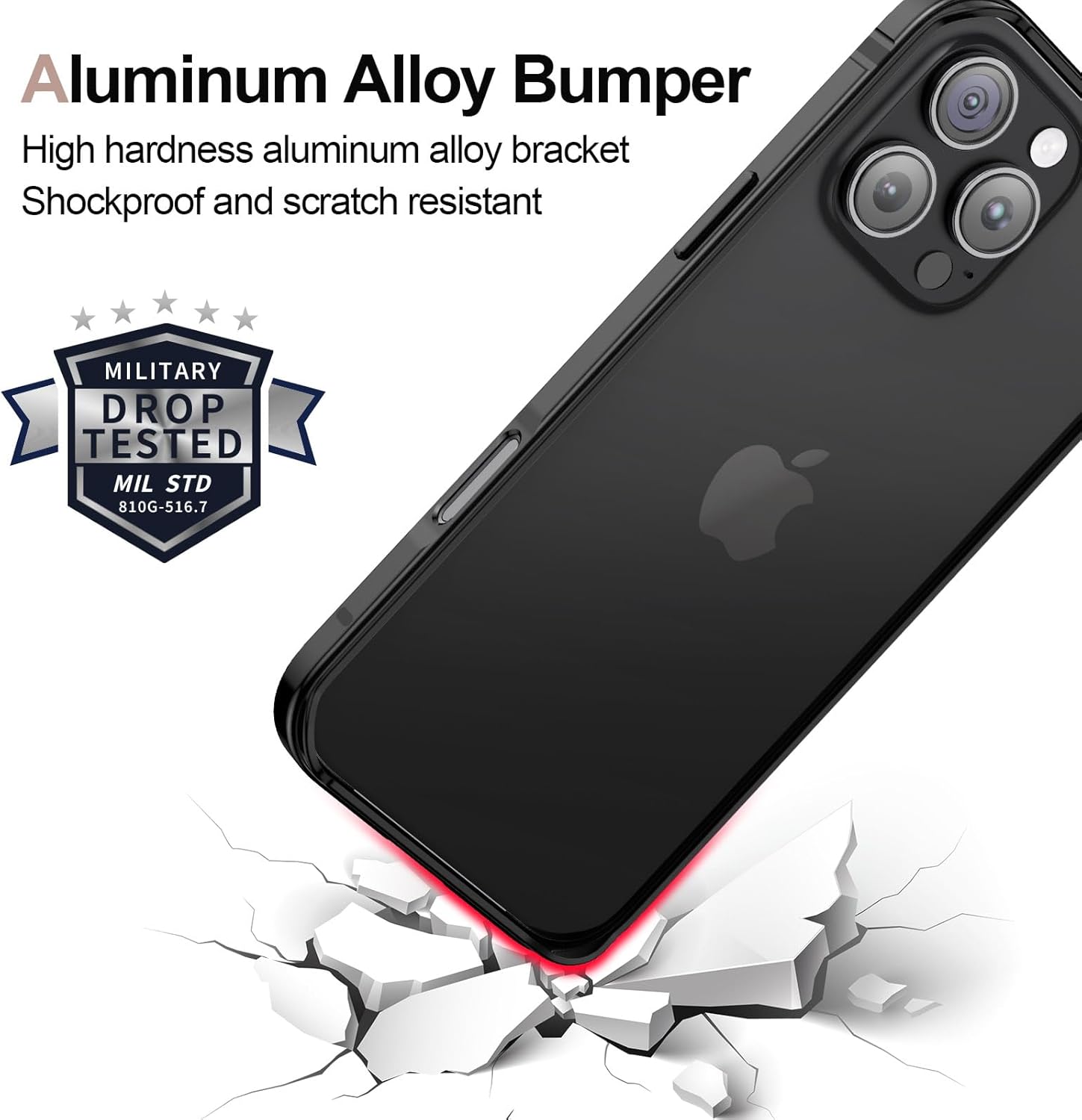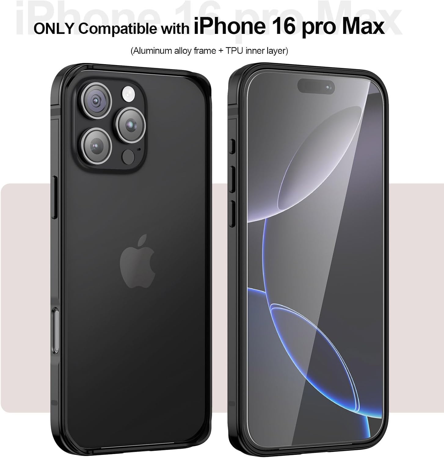 Capa de metal para iPhone 16 Pro Max, capa fina com moldura de alumínio [amortecedor interno macio][proteção de borda elevada] Capa protetora de tela de vidro temperado HD para iPhone 16 Pro Max de
