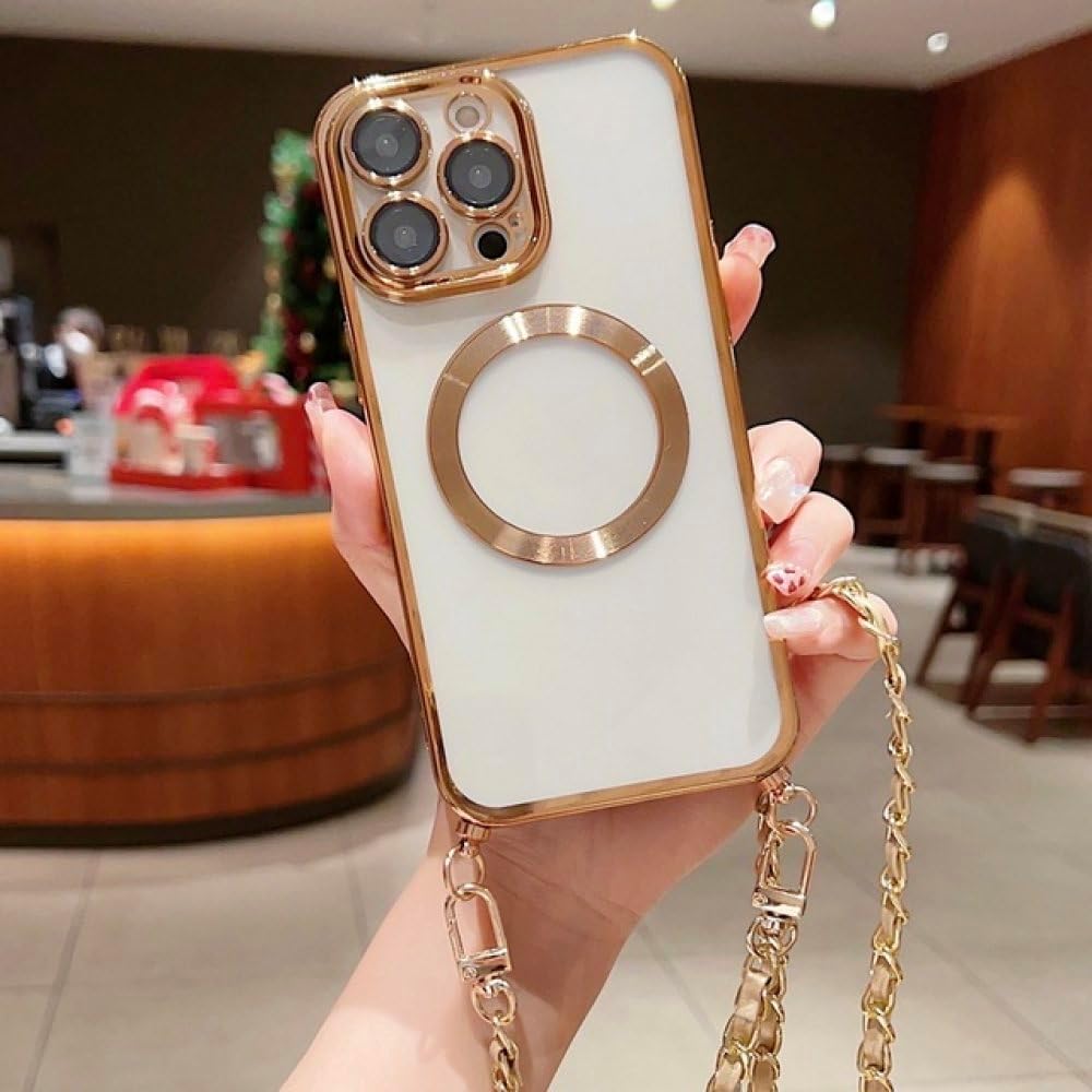 Capa de telefone com alça transversal para iPhone 14 13 12 Pro Max 11 14 Plus À prova de choque para carregamento sem fio Capa transparente, dourada, para iPhone 13 Pro
