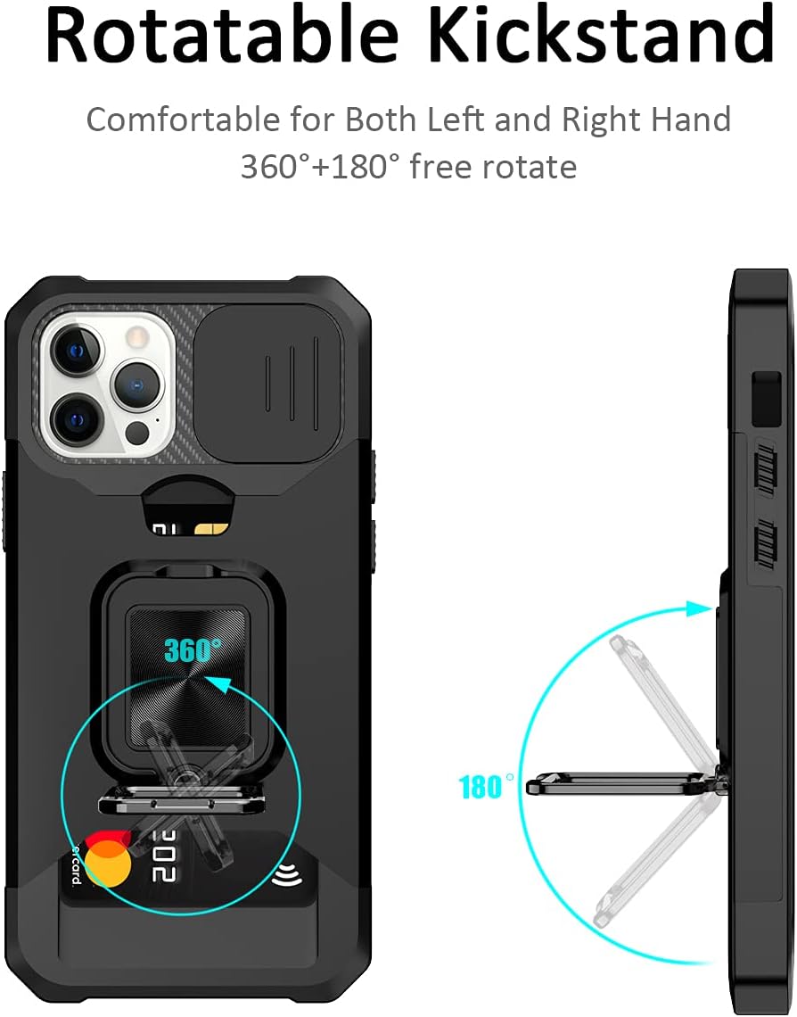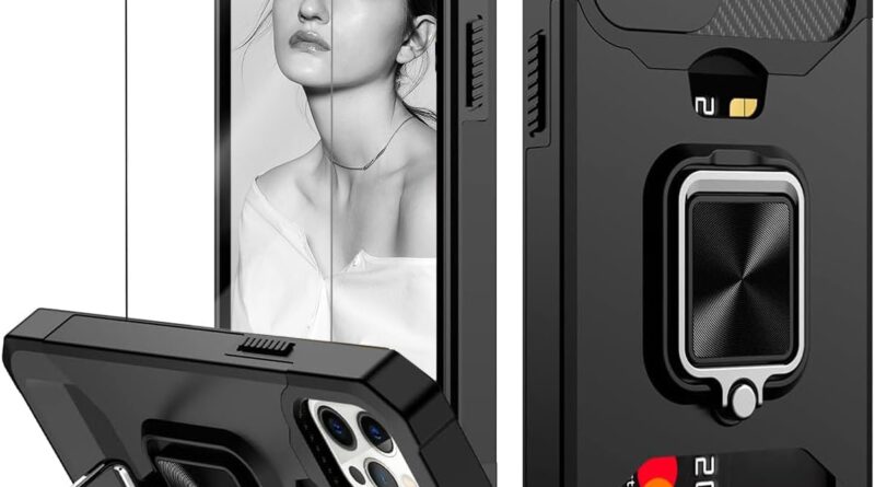Capa para cartão iPhone 12 Pro Max Capinha | com dois protetores de tela e suporte para telefone com anel giratório de 360° integrado – Preto