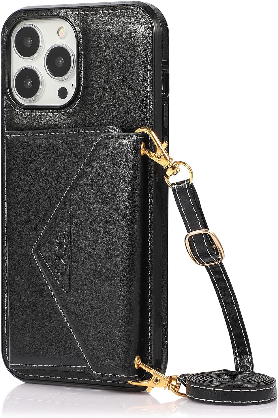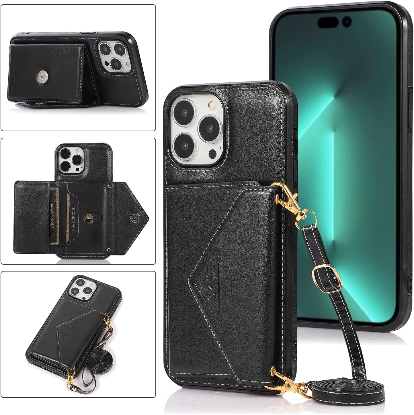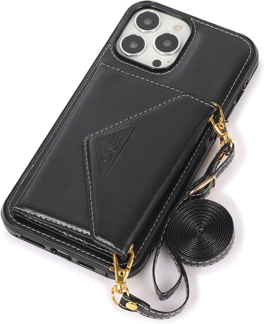 Capa para iPhone 12 Pro Max com porta-cartões de crédito e alça para transporte, também pode ser usada como suporte para celular – Preto