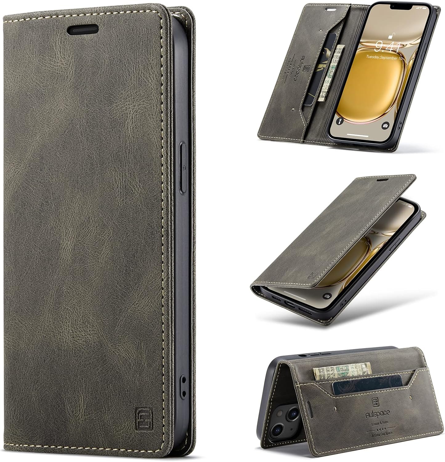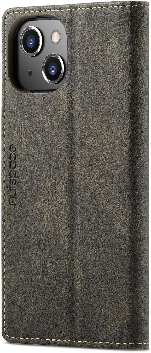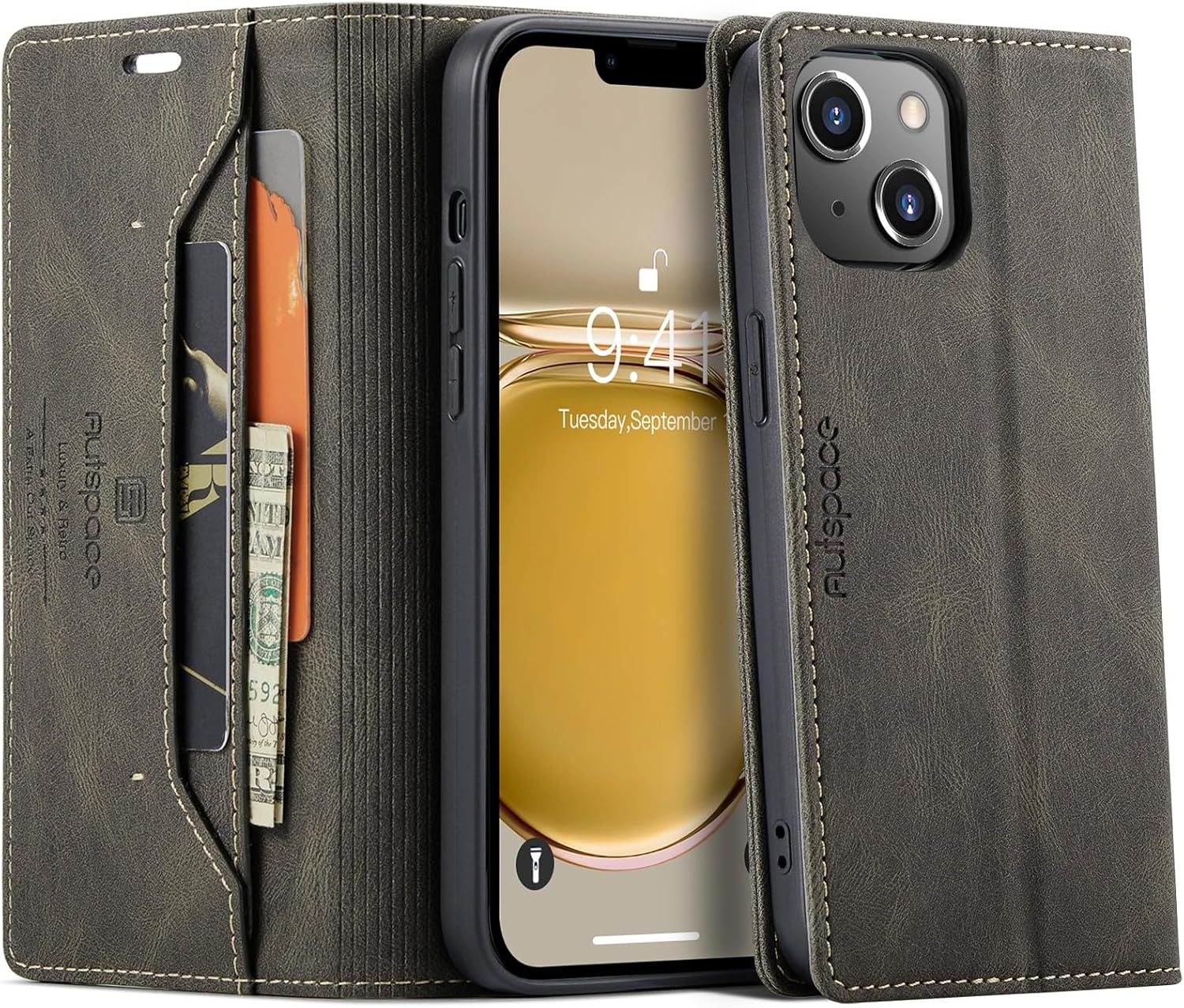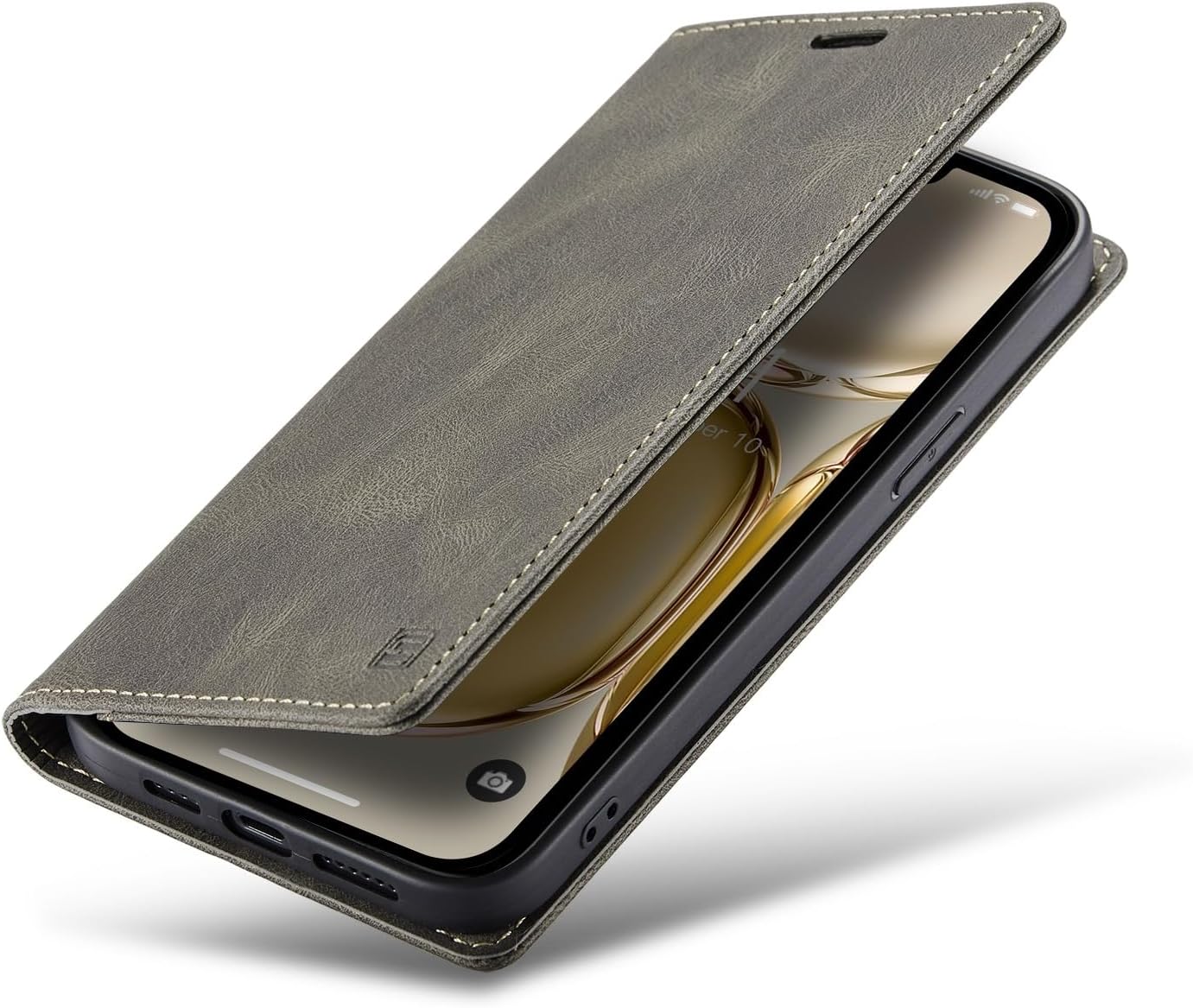 Capinha de Couro para iPhone 15, Capa Carteira com Ímã, Suporte Dobrável (MARROM)