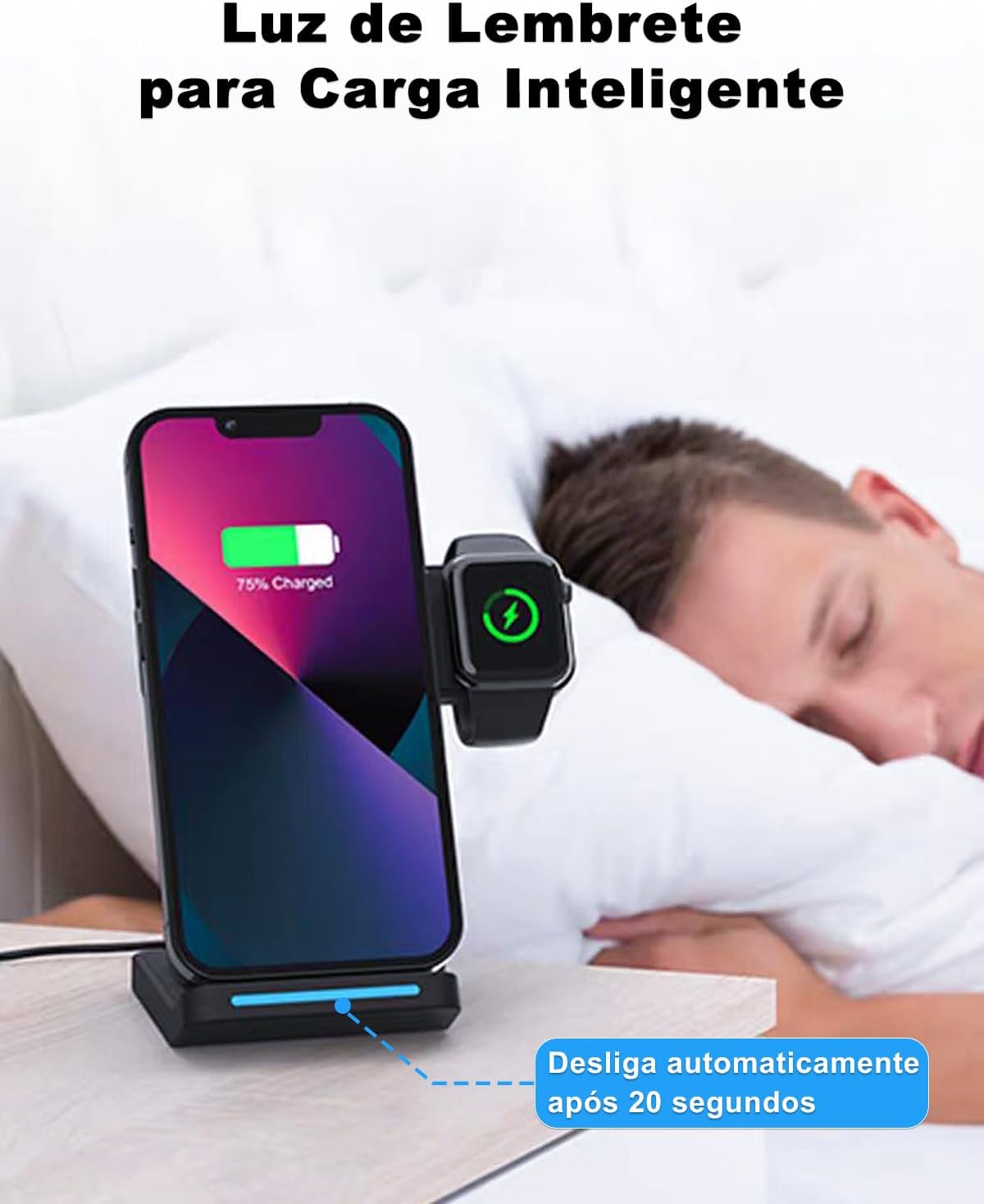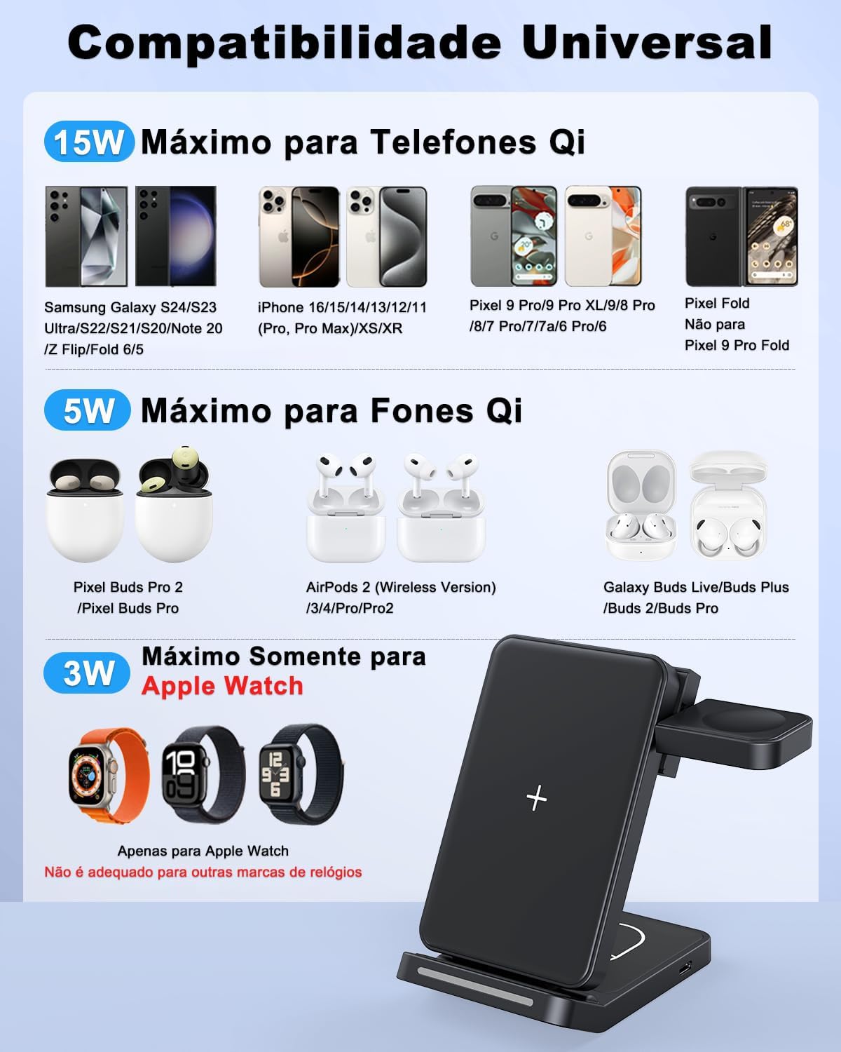 Carregador por Indução 3 em 1: Esta é uma estação de carregamento sem fio 3 em 1 conveniente, compacta e dobrável. Amplamente compatível com smartphones e fones de ouvido Android e iOS com suporte a Qi. A estação de carregamento pode carregar vários dispositivos ao mesmo tempo, e a estação de carregamento sem fio é ideal para AirPods 1/2/3/AirPods Pro/Pro2 com estojo de carregamento sem fio (funciona apenas com o tipo de interface “Lightning”), para Apple Watch 10/9/Ultra/8/7/6/5/4/3/SE (Observação: apenas para Apple Watch, não para Samsung ou outros relógios).