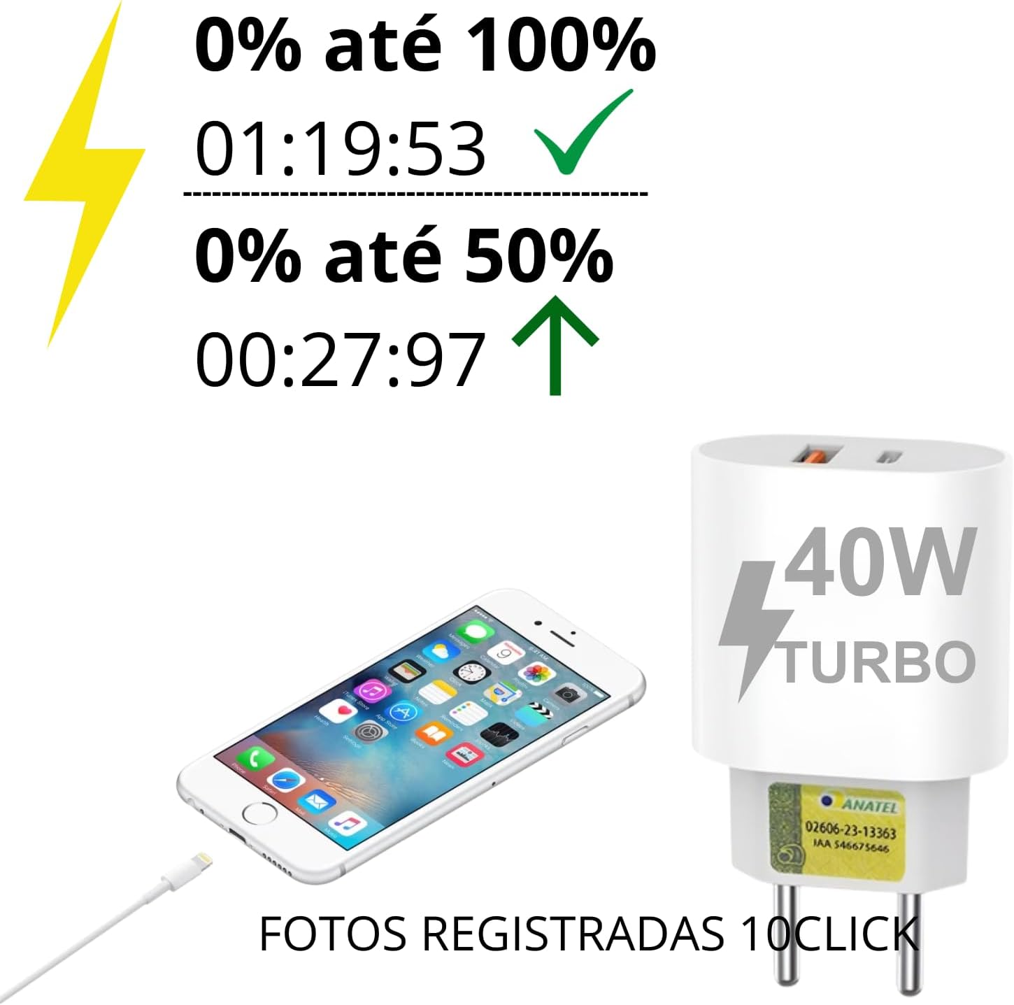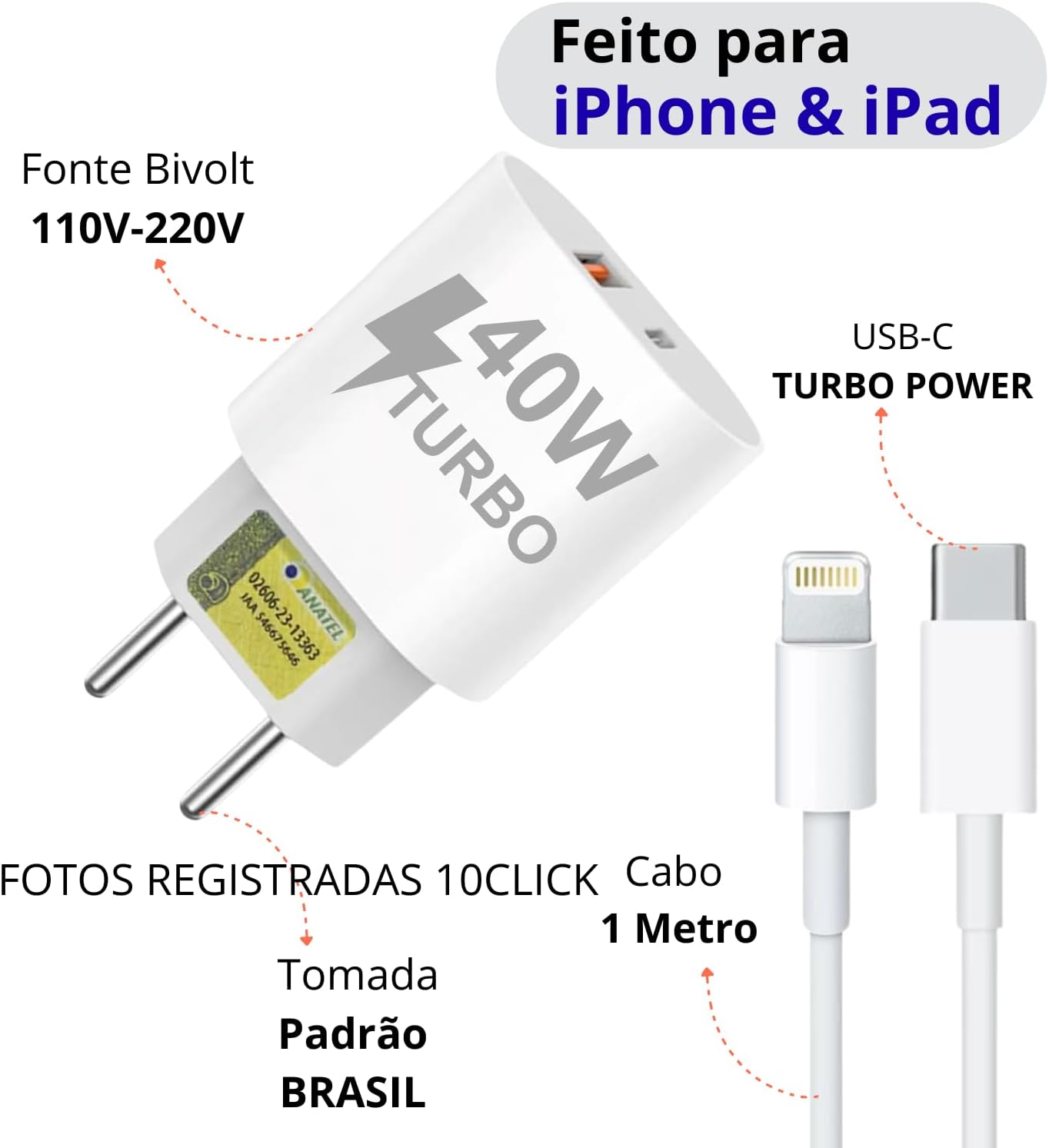 Carregador Turbo 40W Compatível iPhone 7 8 X XR XS 11 12 13 14 Pro Max Plus iPad iOS Cabo USB-C Lightning Duas Saídas USB-A Tipo-C Carga Rápida PD Ultra Resistente Premium Original Potente 10CLICK®