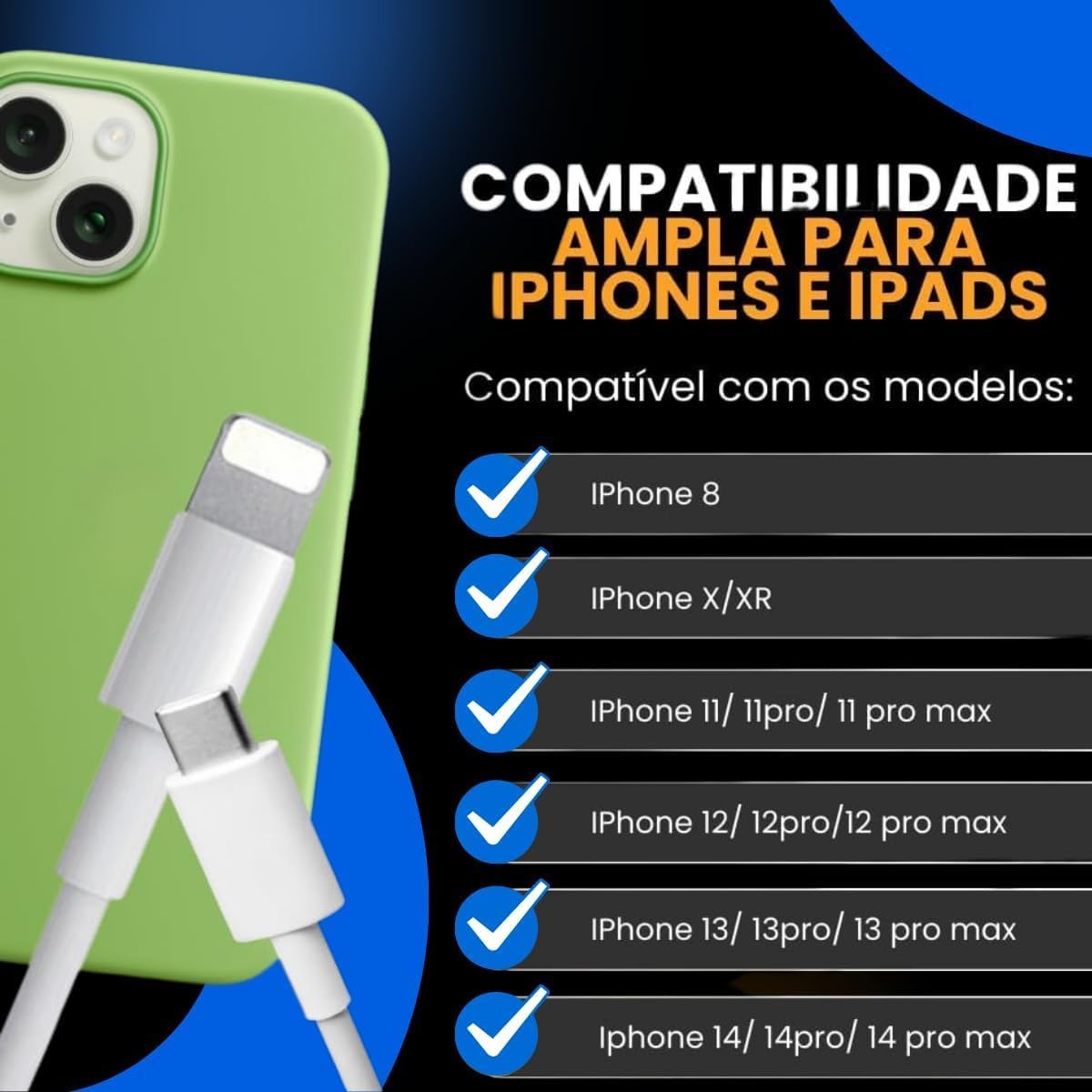 ✅Compatibilidade ampla: Funciona com diversos modelos, incluindo iPhone 6 até iPhone 14 Pro Max e iPad.