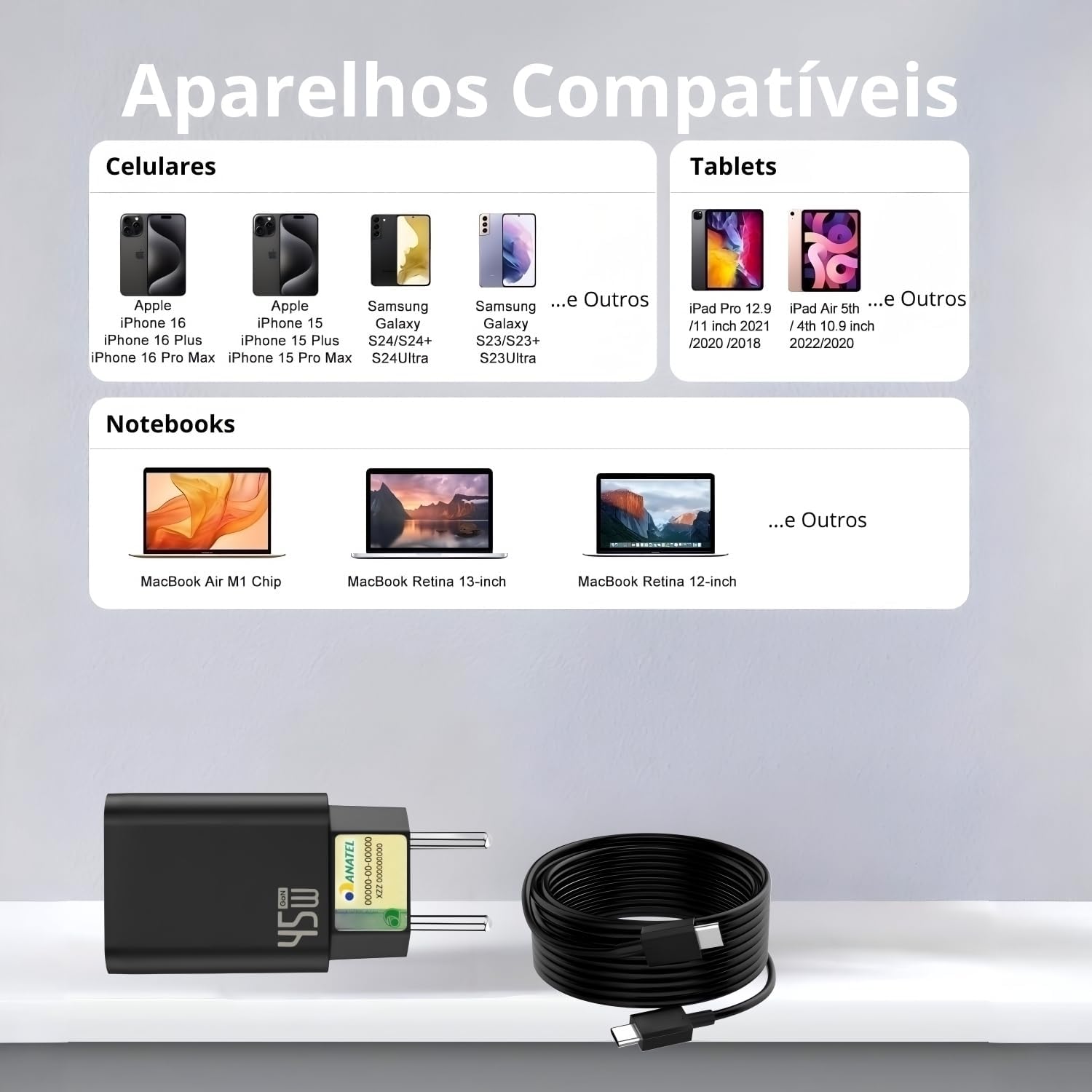 - Compatibilidade Universal: Compatível com iPhone, iPad, Samsung, LG, Motorola e qualquer dispositivo com entrada USB-C. Um carregador versátil para todos os seus gadgets!