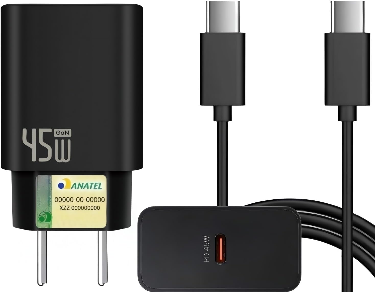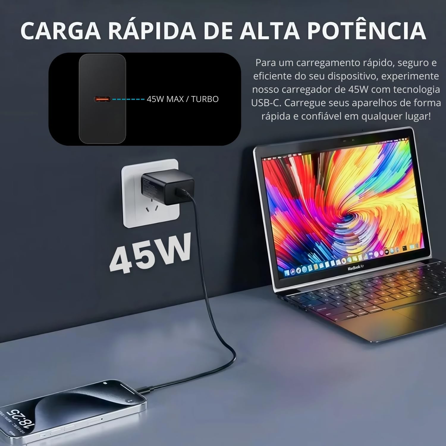 - Potência: 45W (USB-C), proporciona carregamento rápido sem comprometer a segurança