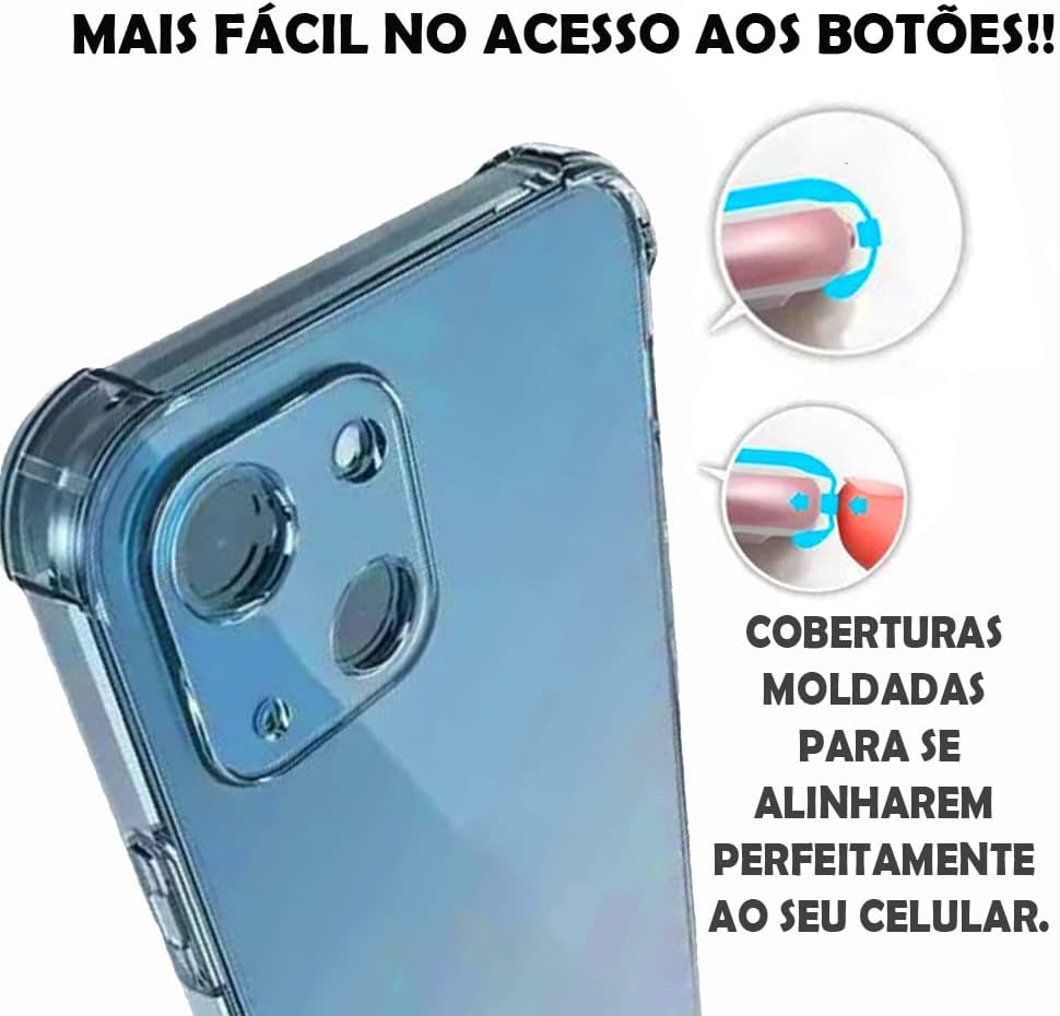 Com bordas laterais estrategicamente elevadas, nossa capa assegura uma proteção robusta para a câmera e a tela frontal do seu precioso aparelho. Não se preocupe mais com arranhões indesejados ou danos causados por quedas acidentais.