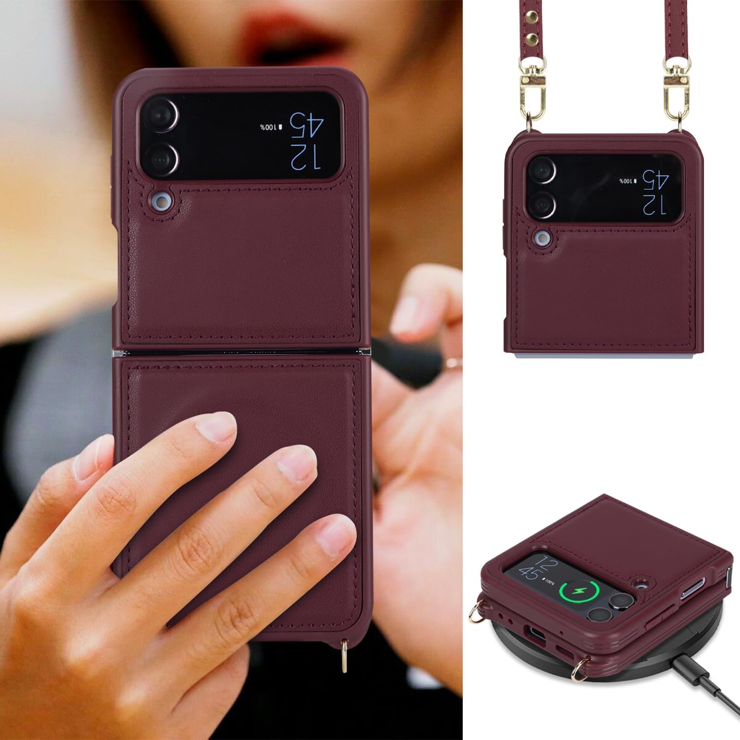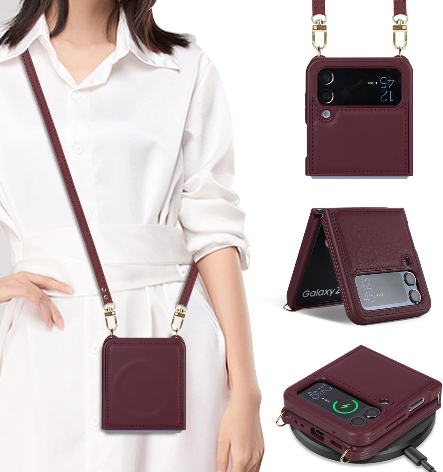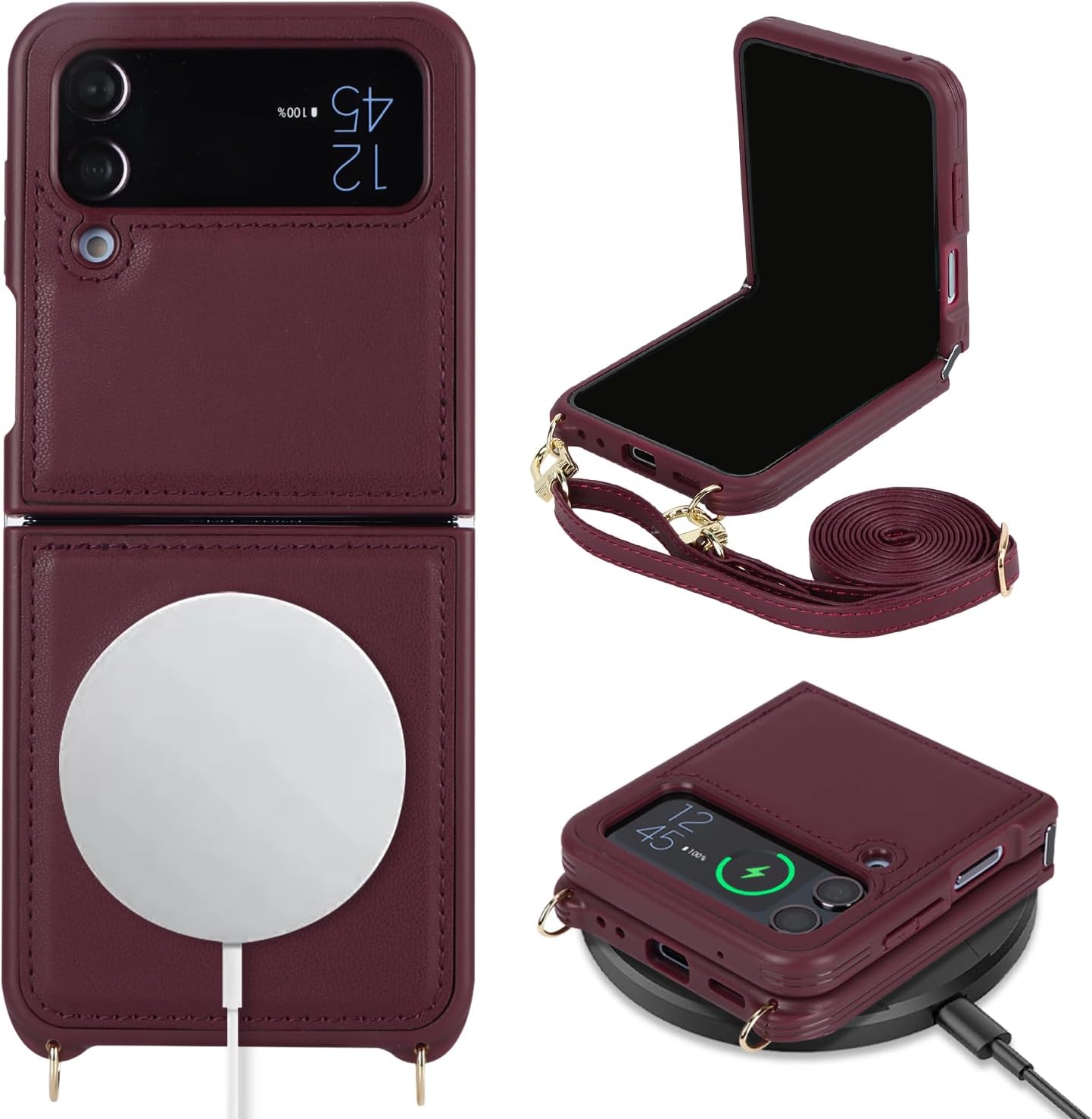 Cavor Capa para Samsung Galaxy Z Flip 4, compatível com Magsafe para mulheres, capa de telefone para Z Flip 4 com cordão transversal, capa de couro à prova de choque – vermelho vinho
