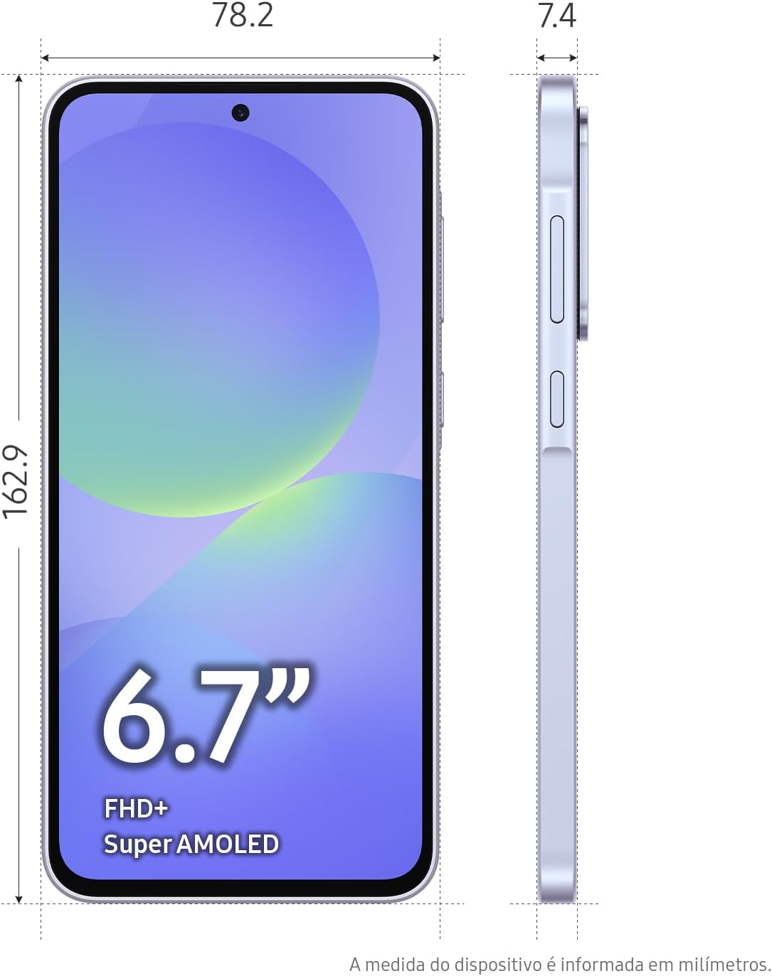 A Samsung apresenta o seu mais novo lançamento, o Galaxy A36 5G. O celular feito para durar e atualizado por mais tempo, oferecendo uma experiência duradoura e segura, assegurando até 6 atualizações de sistema operacional Android e até 6 anos de atualizações de Segurança. O modelo conta com proteção IP67, garantindo resistência à água e poeira. A novo Galaxy A36 5G, se destaca ainda mais pelas suas funções de AI, com uma inteligência absurda, através do Circule para Pesquisar no Google e as funções de edição inteligente. Capture os melhores momentos com uma câmera tripla de alta resolução, oferecendo selfies impressionantes e vídeos cristalinos. A Câmera Tripla de até 50MP com recursos de AI e Nightography, assim como a Selfie de 12 MP, garantem diversas possibilidades para que as suas fotos fiquem incríveis. Com Nightography, você não precisa se preocupar em tirar fotos em ambientes com pouca luz, pois ele garante fotos nítidas mesmo nestas situações. A edição inteligente de fotos permite que você crie seus próprios filtros com a AI, ajuste o contraste, saturação, temperatura e cor com vários estilos de filtro. Apagador de Objetos melhorado com AI, traz sugestões para remover elementos indesejados em suas fotos. Já o Circule para Pesquisar no Google, permite que você busque, a qualquer momento, o que vê diretamente na tela do seu smartphone, incluindo a pesquisa através de sons. Circule para encontrar resultados instantâneos na ponta dos dedos, sem precisar abrir outros aplicativos. Para os Gamers, experimente uma alta velocidade e desempenho de jogos com a câmara de vapor maior e o Snapdragon 6 Gen 3 (4nm), um processador aprimorado. O Galaxy A36 5G conta com armazenamento de até 256GB e memória RAM de até 8GB. Desfrute dos seus conteúdos favoritos através de uma tela maior, mais brilhante e imersiva de 6.7″ Super AMOLED com Vision Booster. Assista seus conteúdos em cores realistas, acompanhe as redes sociais da melhor forma, mesmo sob a luz do sol, pois o Vision Booster preserva os detalhes, permite uma experiência imersiva com as bordas mais finas e tela ainda maior. O seu novo design, com acabamento minimalista e elegante permite um manuseio confortável. É perfeito para entretenimento ininterrupto e desempenho suave. Várias opções de memória garantem que você nunca ficará sem espaço! O Galaxy A36 5G possui ainda 4 opções de cores para que possa escolher a que mais combina com você: Preto, Branco, Verde e Violeta. Fique imerso nos seus conteúdos favoritos com uma tela gigante e áudio vibrante, aproveite o que você mais ama com sons ricos e visuais incríveis com detalhes vívidos tendo uma incrível experiência com Dolby Atmos. O Galaxy A36 5G é o celular que permite que você esteja sempre conectado, tudo isso por conta da sua bateria de longa duração de 5.000 mAh e um carregamento rápido de até 45W. Você pode assistir a conteúdos, realizar diversos downloads e utilizar o seu celular sem faltar energia.