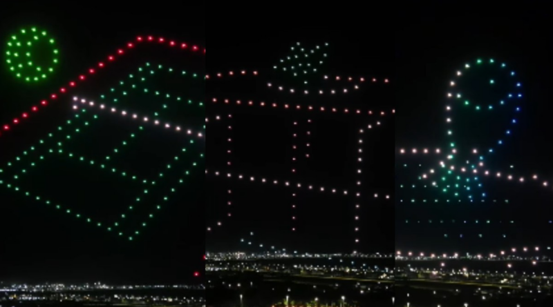 No final da festa, os 200 drones subiram no céu e alternaram entre imagens e mensagens que descreviam o condomínio.