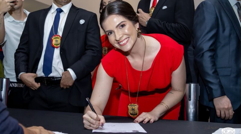 Raphaela Natali Cardoso, de 31 anos, assinando termo de posse como delegada da Polícia Civil em SP.