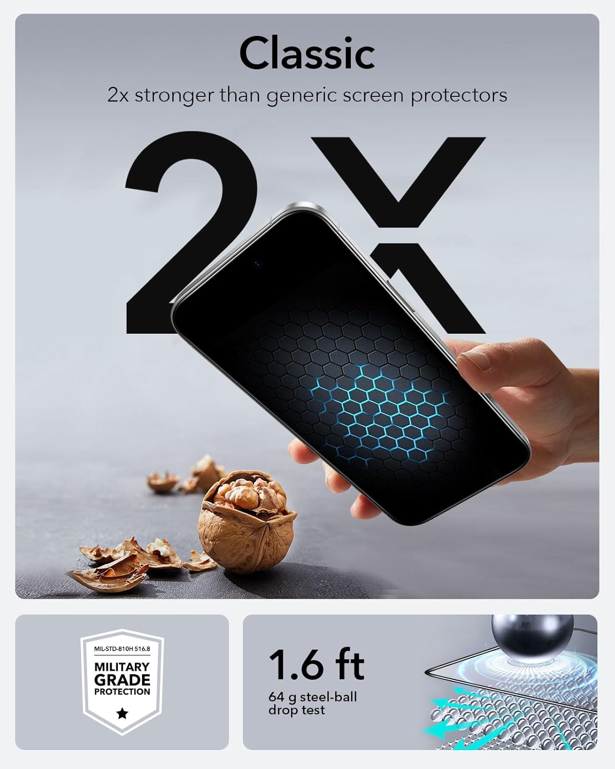 Defesa de nível militar: o vidro temperado ultrarresistente resiste a até 15 kg de força para defender sua tela contra quedas, batidas e arranhões