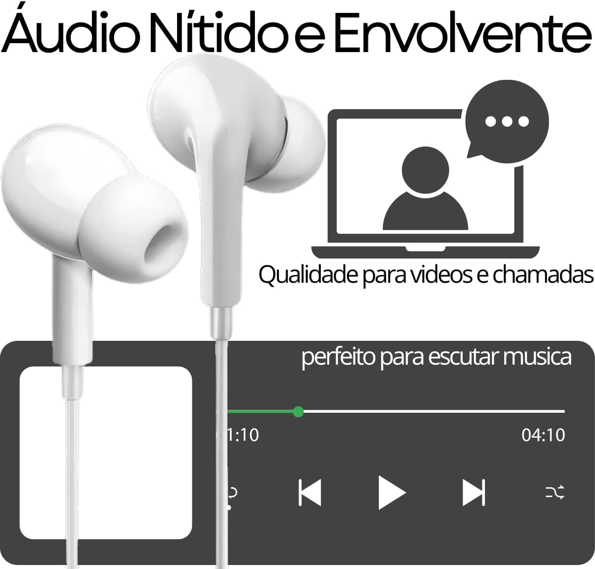 🎵 Áudio Nítido e Envolvente Drivers balanceados que oferecem excelente clareza nos graves, médios e agudos Isolamento de som A borracha ajuda a isolar ruídos externos, o que melhora a imersão no som, graves mais potentes porque vedam melhor o canal auditivo. perfeito para músicas, vídeos e chamadas.