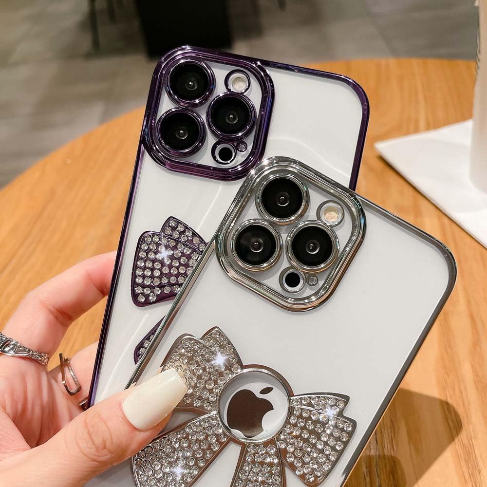 Fycyko Capa feminina para iPhone 12 Pro Max fofa com laço com glíter, strass, brilhante, luxuosa, feminina, feminina, capa protetora, diamante brilhante para iPhone 12 Pro Max, prata gradiente