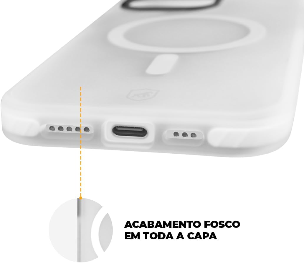 A capa vem equipada com um anel magnético de alta qualidade integrado, especialmente projetado para oferecer compatibilidade total com acessórios MagSafe. Esse anel garante uma conexão segura e precisa com carregadores, suportes e outros acessórios, proporcionando uma experiência de uso prática.