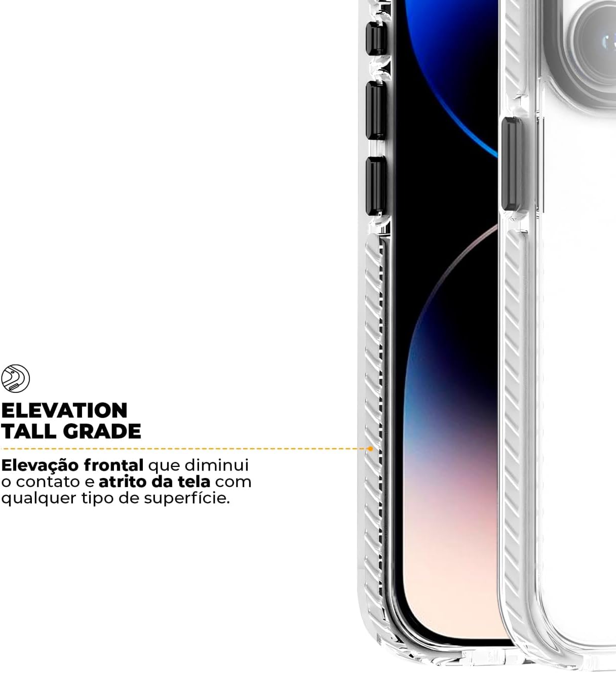 Seu design moderno e acabamento refinado proporcionam um toque de sofisticação, enquanto a proteção premium mantém o seu dispositivo protegido. A elevação presente na traseira da capa reduz o contato direto entre as superfícies e o smartphone, assegurando que sua câmera permaneça intacta.