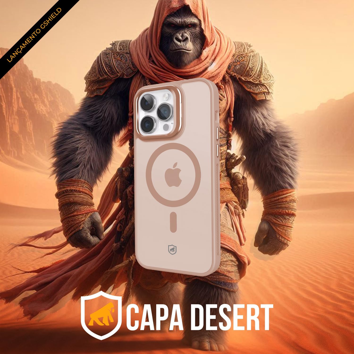 Inspirada nos tons suaves do deserto, a Titanium Desert combina elegância e modernidade. Seu acabamento fosco e toque suave proporcionam um visual sofisticado, enquanto o design minimalista reforça o estilo premium do seu iPhone.