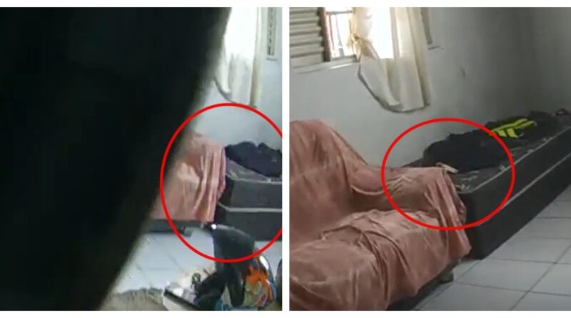 Às 10h58, a câmera mostra apenas um casaco sobre a cama. Dois minutos depois, a pistola aparece no mesmo local.