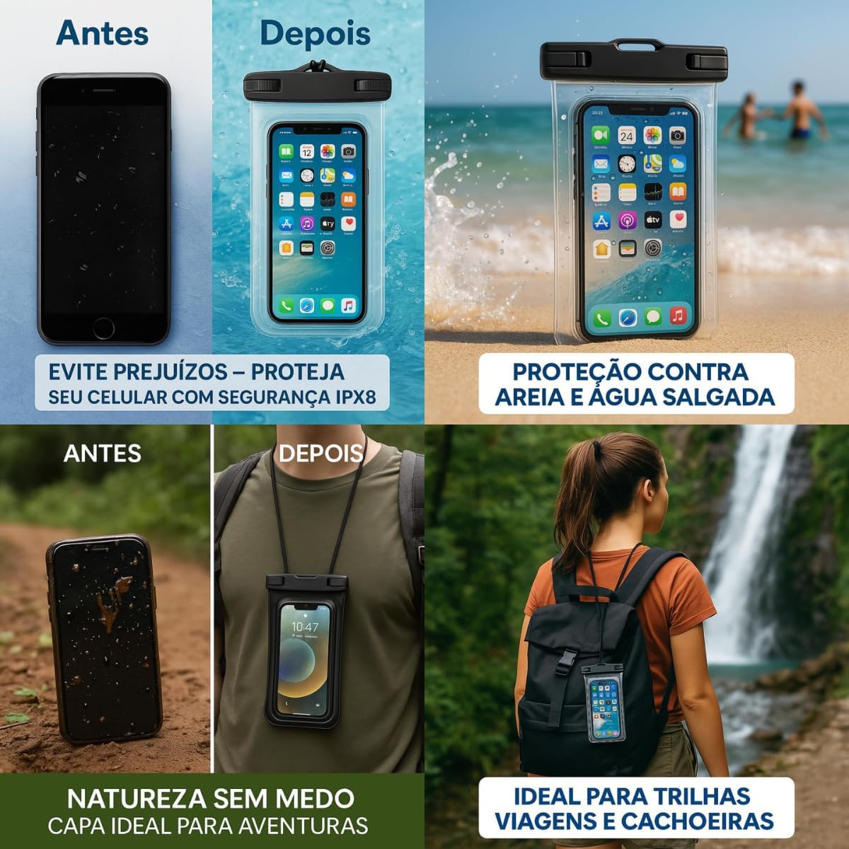 ⚠️ Antes de usar com eletrônicos, coloque um papel seco dentro da capa, feche bem e mergulhe por 10–15 minutos em um recipiente com água.