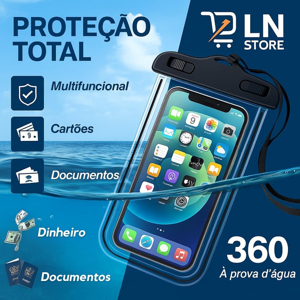 Tenha segurança total na praia, piscina, viagens e esportes aquáticos com a nossa capa 100% IMPERMEÁVEL! Mais do que proteger seu celular, ela é perfeita para armazenar dinheiro, documentos, passaporte, cartões e pequenos objetos com praticidade e vedação completa.
