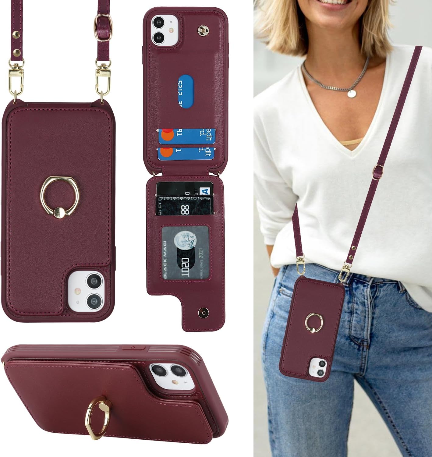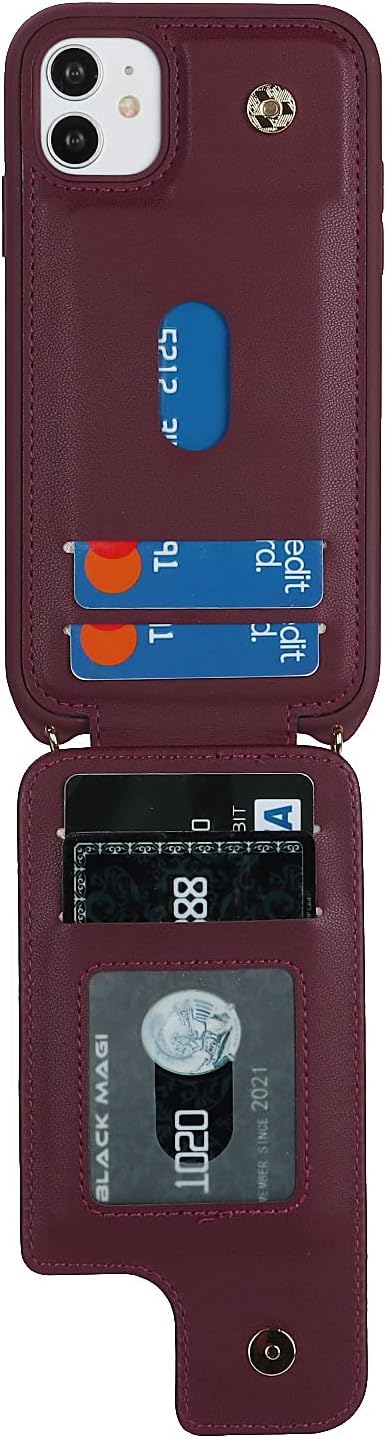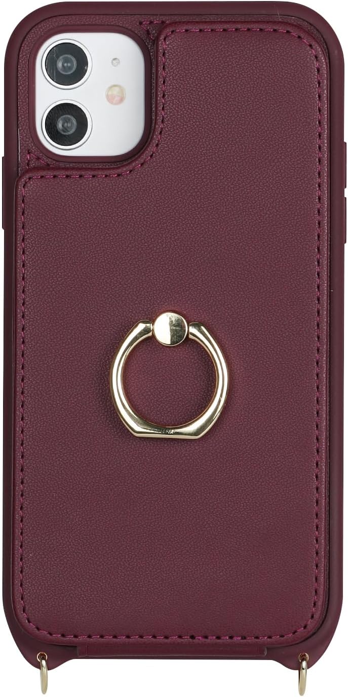 Lipvina Capa de telefone para iPhone 11 com suporte para cartão e alça para mulheres, cordão transversal, suporte de anel de suporte, fecho de pressão, capas carteira de telefone 6,1 polegadas (vinho
