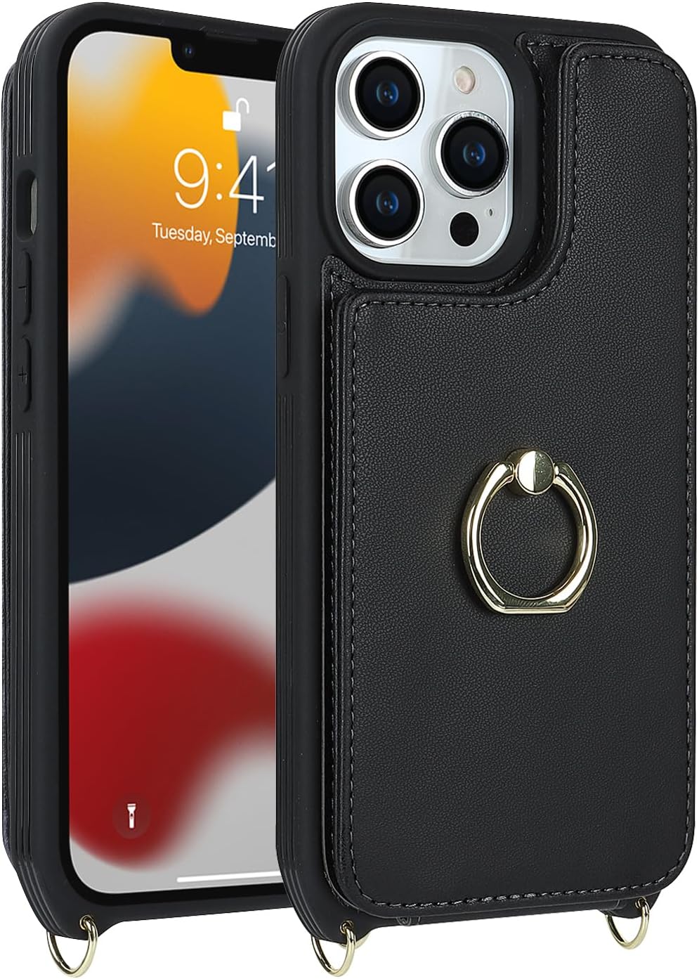 Lipvina Capa para iPhone 13 Pro Max/iPhone 12 Pro Max com suporte para cartão para mulheres, cordão de alça transversal, suporte para cartão de crédito, suporte de anel, fecho de pressão, linda capa