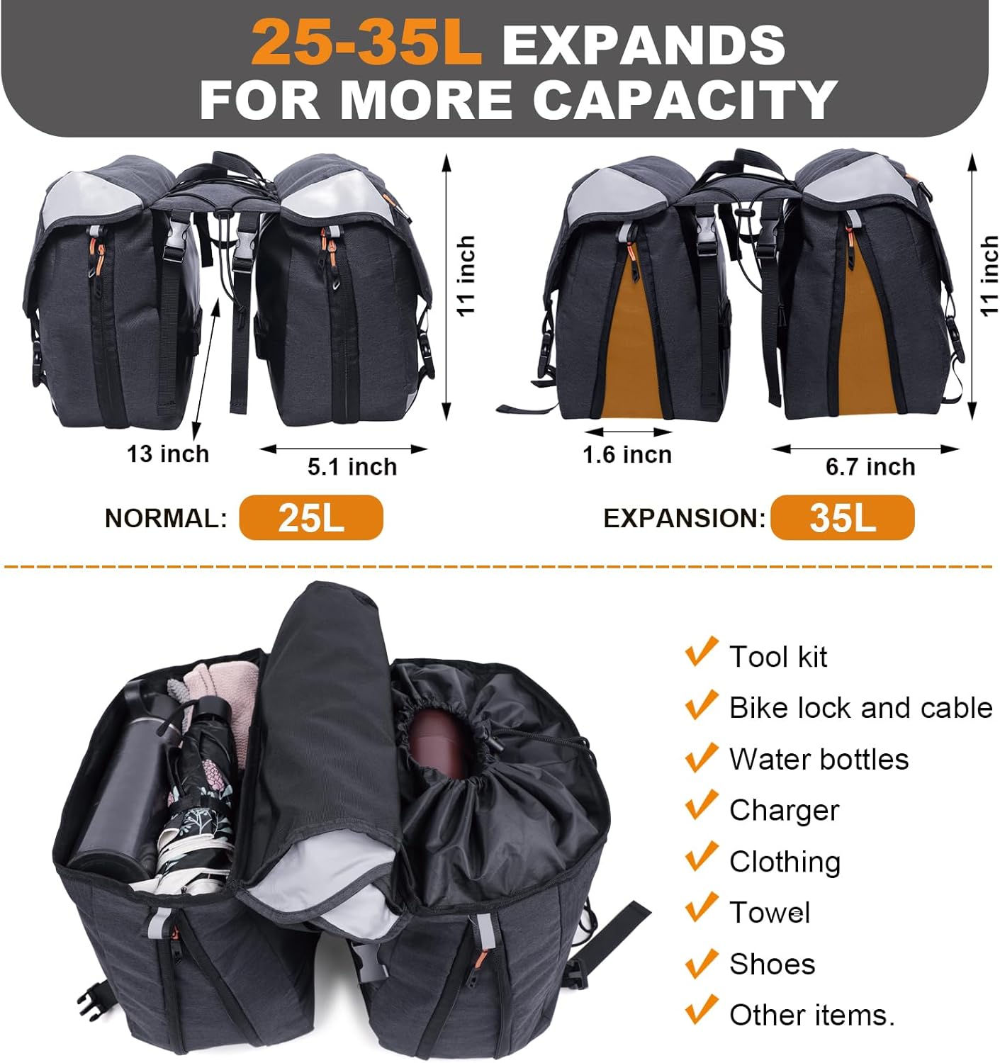 🚴Expandable on both sides (25 to 35L capacity): The NDakter Panniers Bike Bags can hold what you need from your daily commute to a long trip.With an extra-large capacity of 25L to 35L, you can store a wide variety of items, including cycling gear, electronics, and everyday essentials, without worrying about capacity.