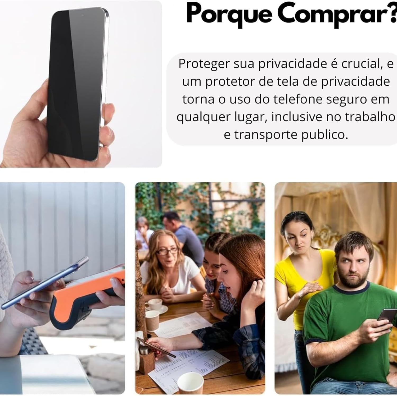 5. Segurança Extra e Proteção Completa: Além da privacidade, nossa película oferece proteção máxima contra arranhões e sujeira. Com bordas arredondadas, ela cobre toda a tela sem afetar o uso de capinhas de proteção.