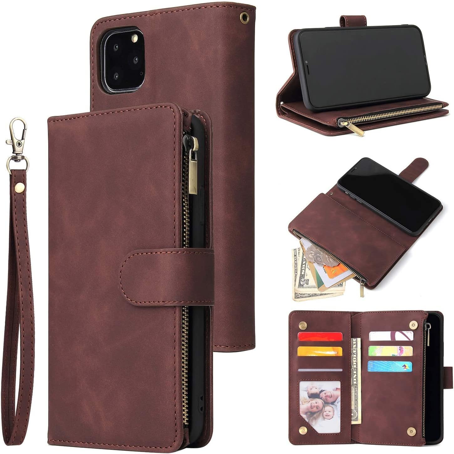QLTYPRI Capa carteira para iPhone 12, bolso premium vintage de couro PU com zíper com compartimentos para cartões, fecho magnético, alça de pulso à prova de choque, capa flip folio para iPhone 12 (6,1