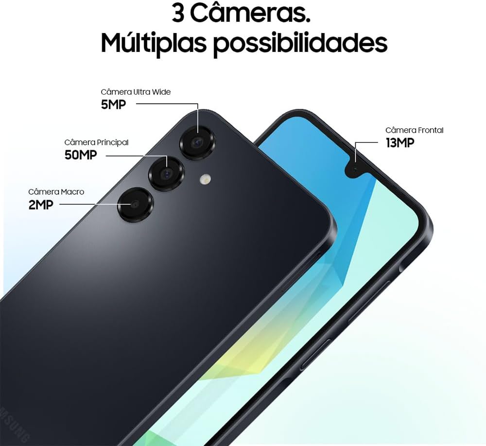 Celular Samsung Galaxy A16, Tela Ampla, Super AMOLED de 6.7″ e 90Hz, 256GB, 8GB, Processador Helio G99, Câmera Tripla Traseira de até 50MP, Selfie de 13 MP, Bateria de 5.000mAh, Dual Chip, Knox Vault, NFC, Samsung Wallet Conheça o novo Galaxy A16, o smartphone que foi feito para durar. Com certificação IP54, até 6 atualizações de Android e Segurança e uma tela Super AMOLED FHD+ de 6.7”, o Galaxy A16 permite que você mergulhe no seu conteúdo favorito com cores vívidas e uma tela ampla. Experimente um desempenho poderoso com o processador Helio G99, 256GB de armazenamento, 8GB de memória RAM e 8GB adicionais de RAM Plus. Ele ainda possui 3 opções de cores para você escolher a que mais combina com o seu estilo: Cinza, Preto ou Verde Claro. Tenha em mãos uma carteira inteligente no seu novo Galaxy A16, para pagamentos rápidos e seguros por aproximação com NFC. A Samsung Wallet permite que você organize todos os seus itens essenciais em um único aplicativo. Carregue rápido e fique conectado por muito mais tempo, aproveitando todos os seus conteúdos sem se preocupar. O Galaxy A16 conta com uma bateria de 5.000 mAh, de longa duração e que suporta o Carregamento Super-Rápido de até 25W. O smartphone ainda conta com Câmera Tripla de múltiplas possibilidades, sendo sua câmera principal de até 50MP com Ultra Wide e a Selfie de 13MP, permitindo a captura de memórias vivas e realistas. Com seu design único com um acabamento mais fino e elegante, o novo Galaxy A16 é o smartphone que possui diversas funcionalidades, sendo versátil e compatível com seu estilo. Sua proteção ainda é aprimorada com Samsung Knox Vault, garantindo que dados confidenciais e sigilosos permaneçam seguros, e, com Cadeado Galaxy, protegendo os seus dados e acessos a aplicativos por terceiros. E com o aplicativo SmartSwitch, você transfere de forma fácil e prática o conteúdo do seu celular anterior (fotos, contatos, eventos do calendário, notas, configurações do dispositivo e muito mais) para o seu novo Galaxy A16. *Acesse: www.cadeadogalaxy.com.br