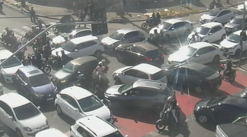 Sem o funcionamento do semáforo e sem a presença de agentes de trânsito para organizar a passagem dos veículos, motoristas e motociclistas enfrentaram dificuldades. As imagens ao vivo mostraram motos tentando se espremer entre os carros parados, muitas vezes invadindo a ciclofaixa na tentativa de avançar alguns metros.