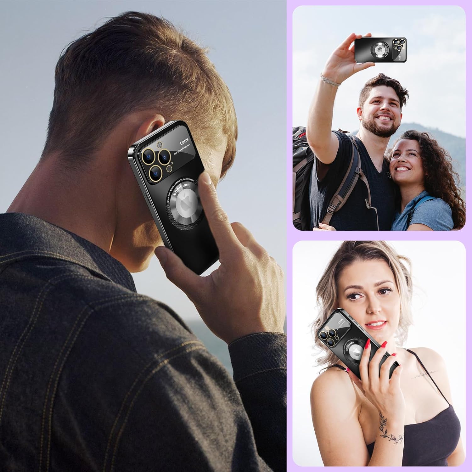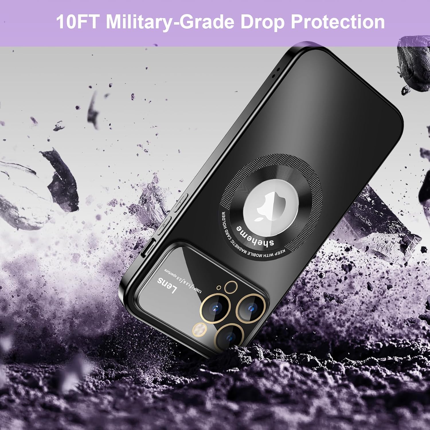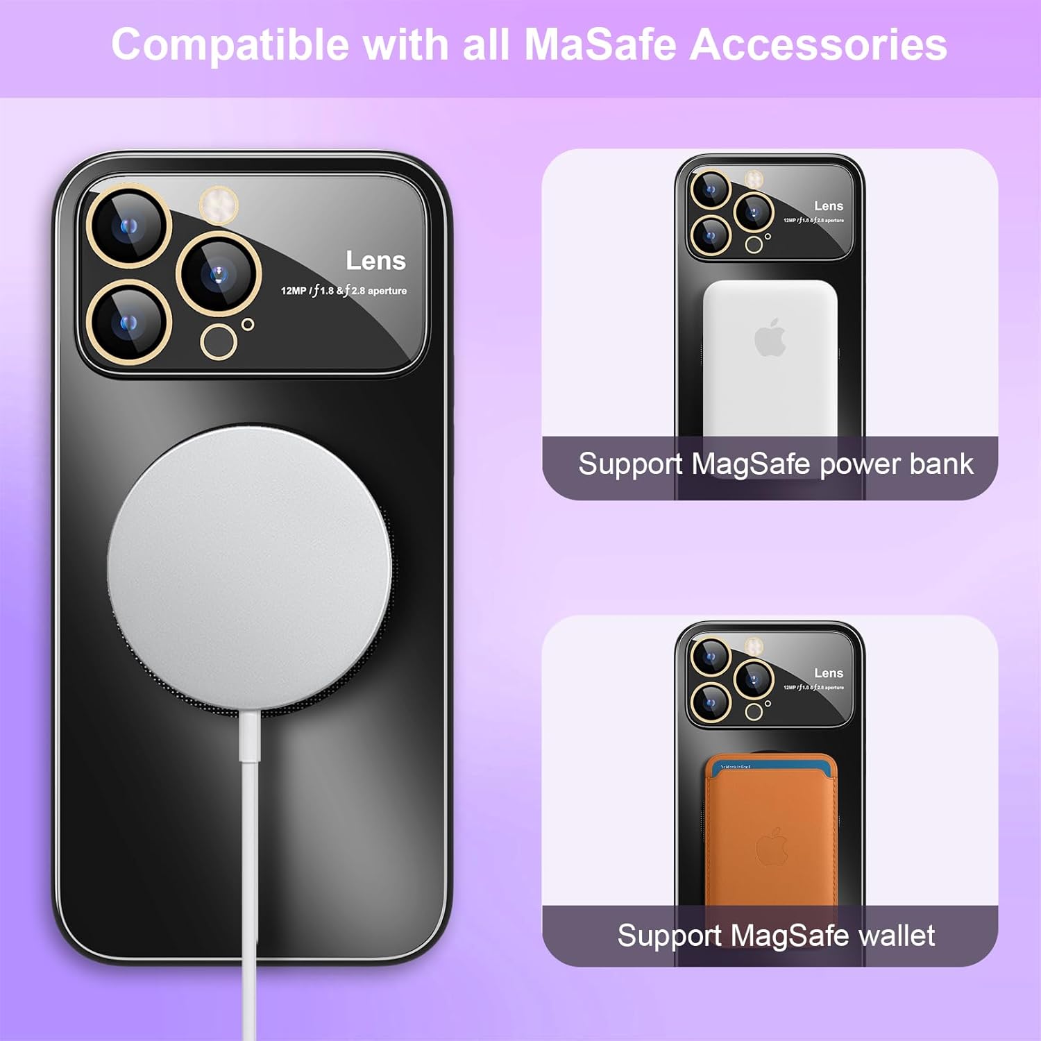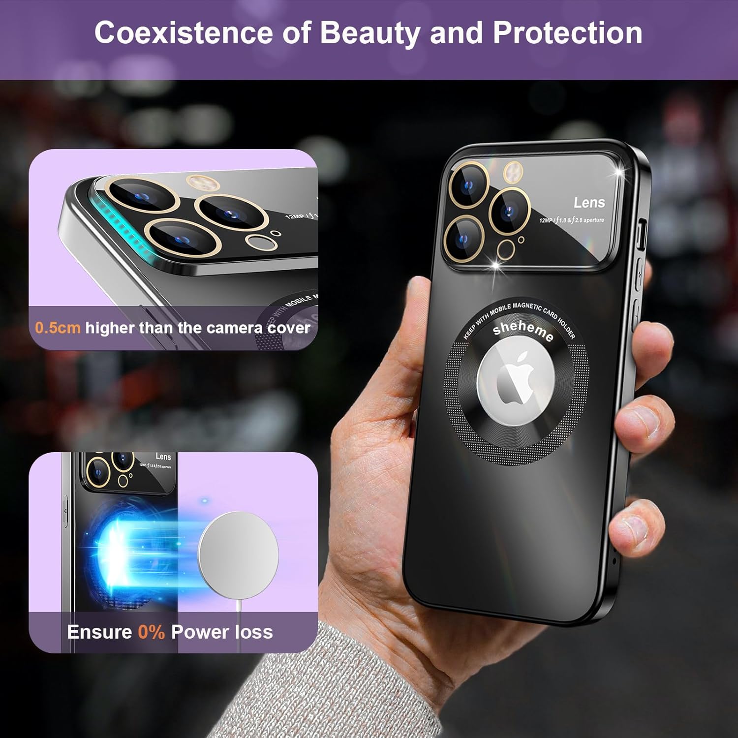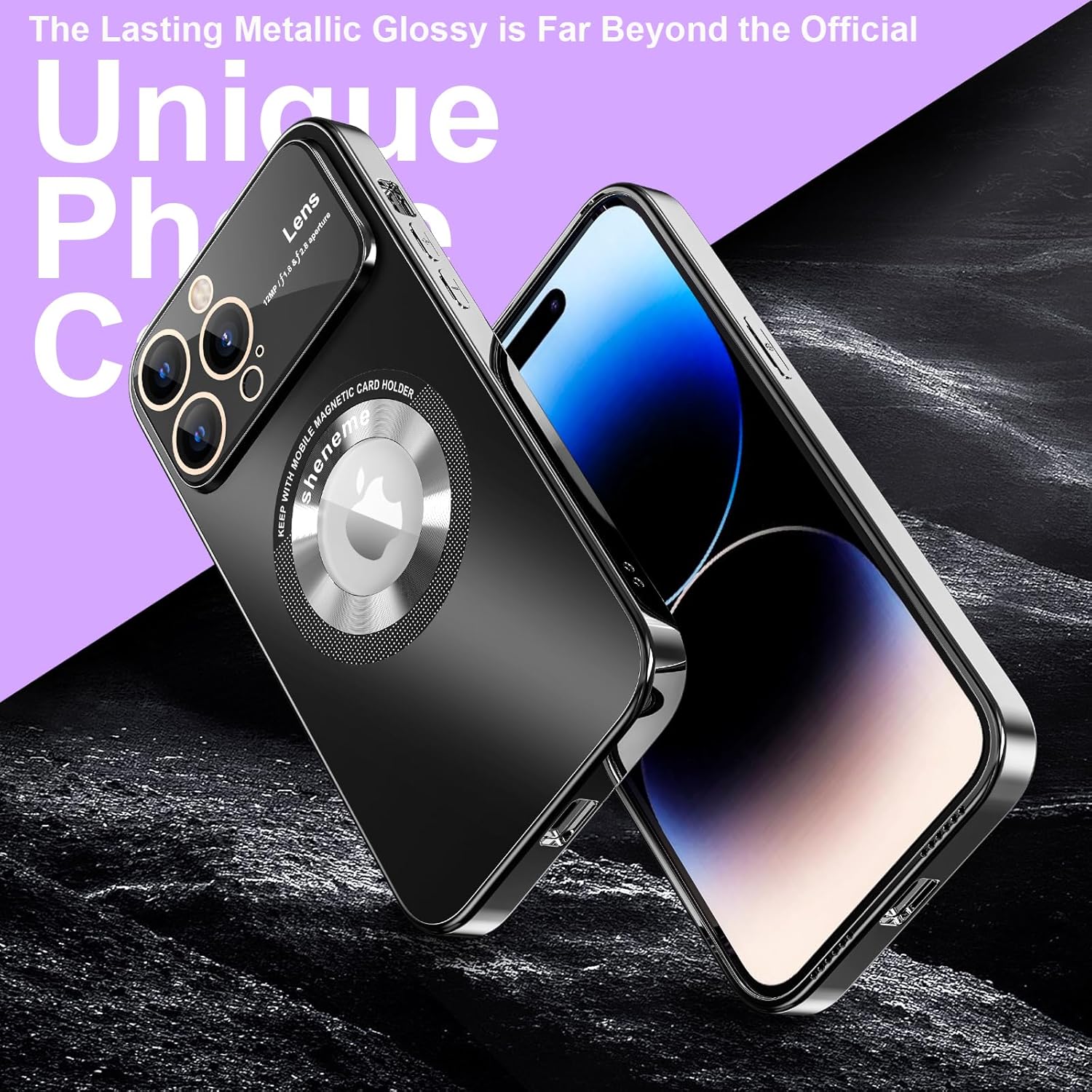 sheheme Capa magnética para iPhone 14 Pro Max MagSafe [protetor de lente de câmera completa] [compatível com MagSafe] Capa brilhante com revestimento de logotipo para iPhone 14 Pro Max 6,7 polegadas, preta