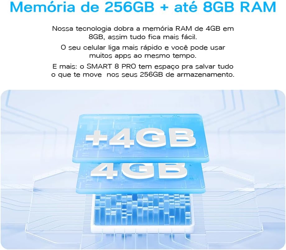 A INFINIX, terceira maior fabricante de celulares do mundo* apresenta o novo SMART 8 Pro, destacando-se com um armazenamento de 256GB e uma memória RAM de até 8GB, composta por 4GB + 4GB adicionais através da tecnologia Memory Fusion. O smartphone vem equipado com uma bateria duradoura de 5000mAh, com tecnologia Power Marathon que traz 3 opções de economia de otimizar energia para se adequar ao que você precisa. Com o Modo Ultra Energia, é possível obter um dia inteiro**em standby ou 2 horas** de ligações com apenas 5% de bateria.