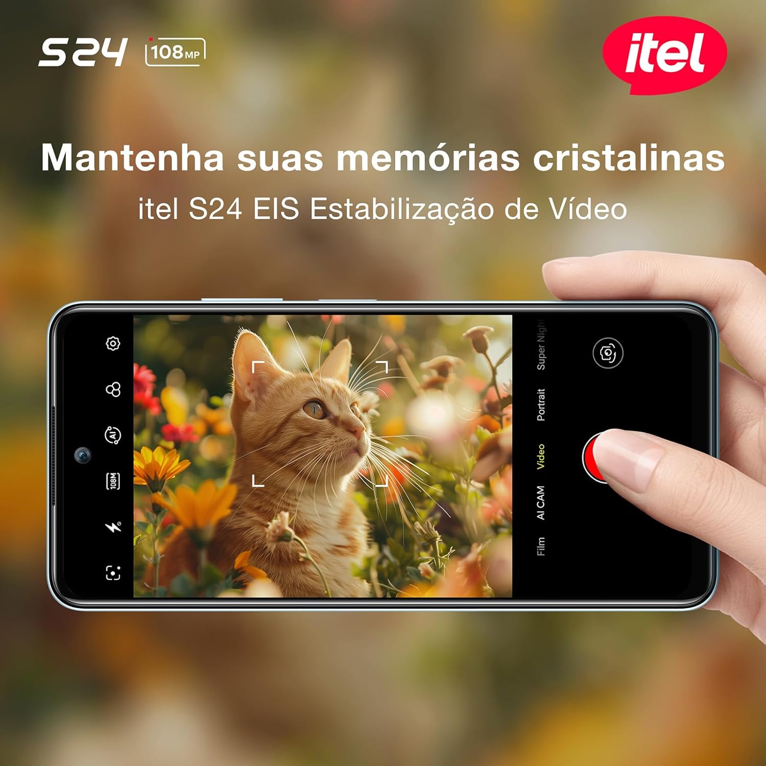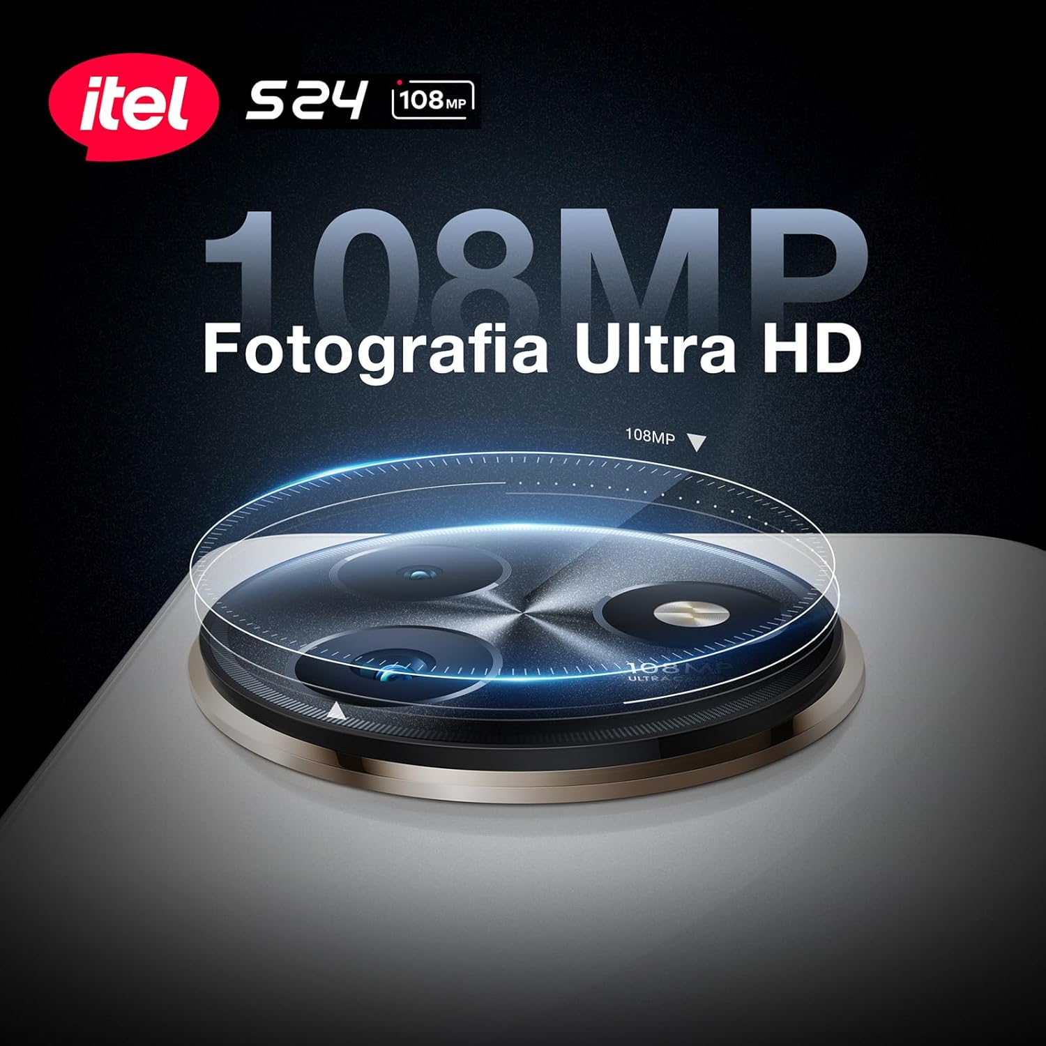 Câmera de 108MP+8MP: Grave vídeos ultraestáveis e tire fotos noturnas de nível profissional. Tire selfies impressionantes com a câmera frontal de IA. Capture cada detalhe com zoom de 10x no smartphone itel S24