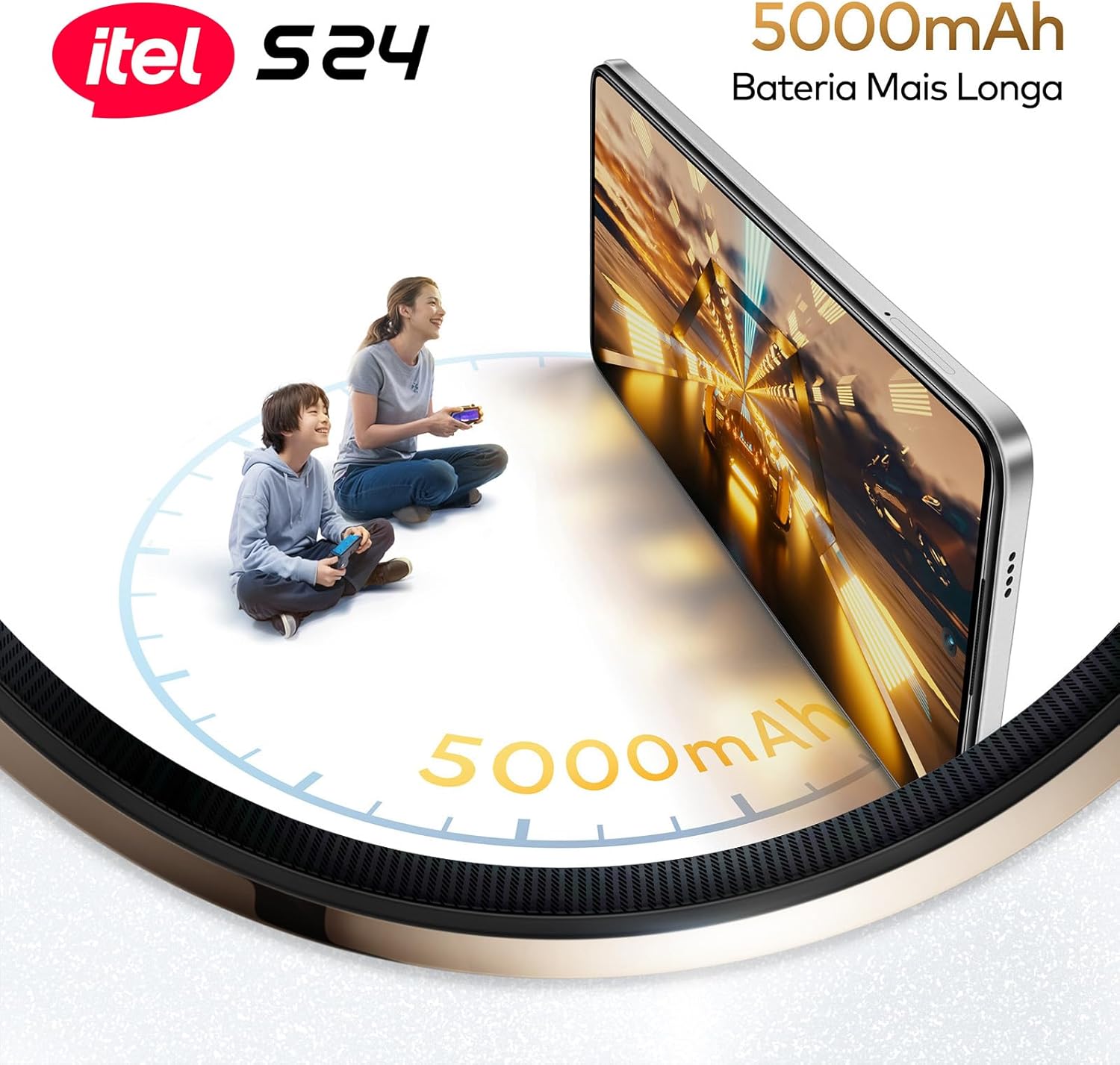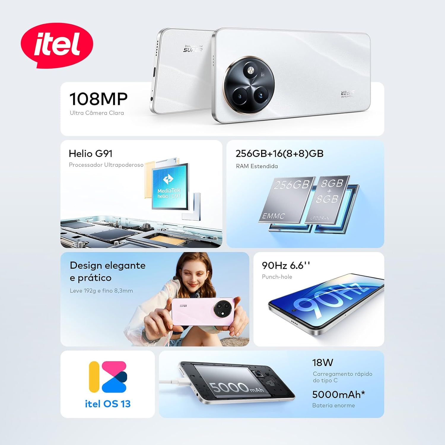Smartphone Itel S24 256GB 8+8GB RAM, Dual SIM, Tela 6,6″, 90Hz, 108MP Câmera, 5000mAh, Branco
