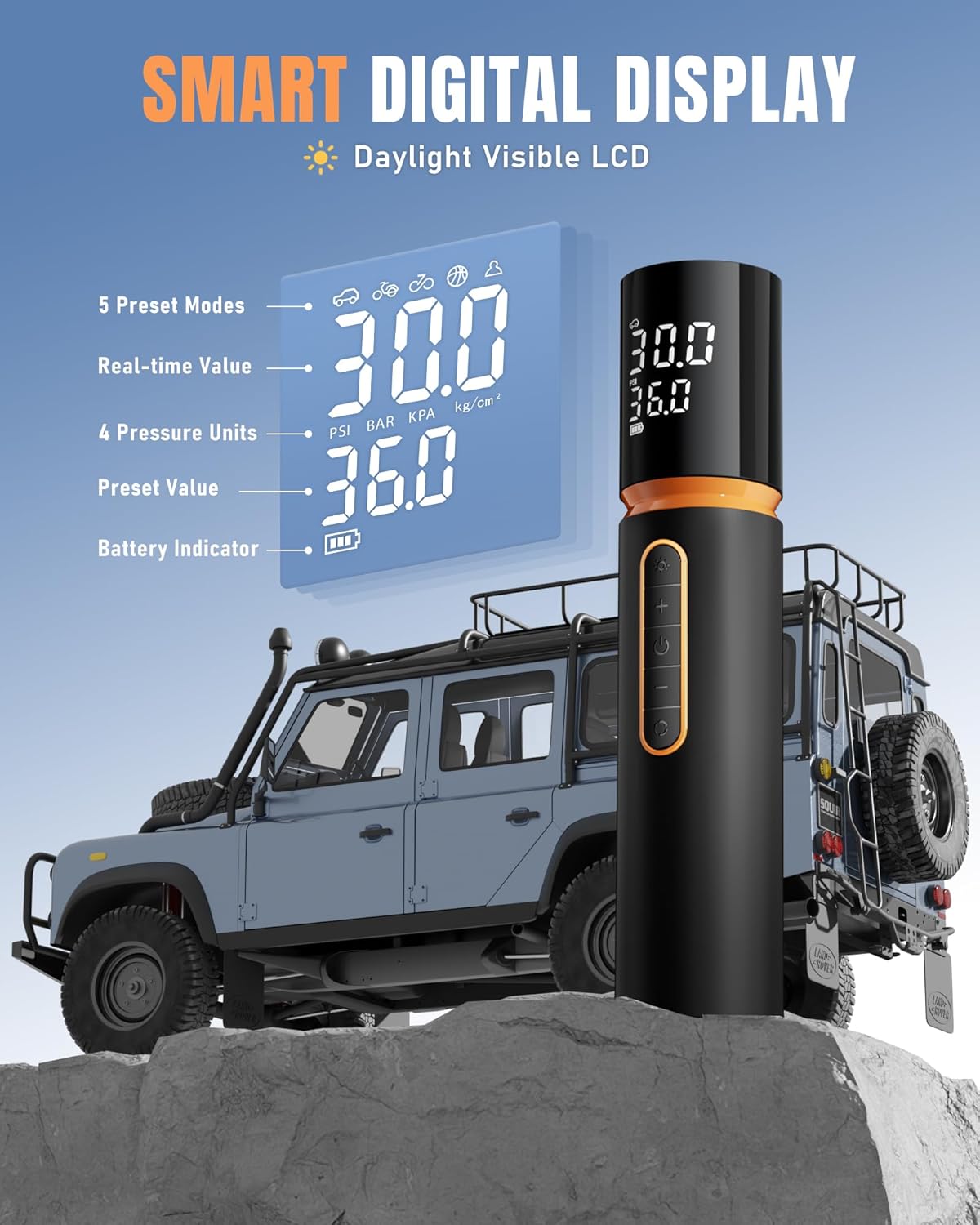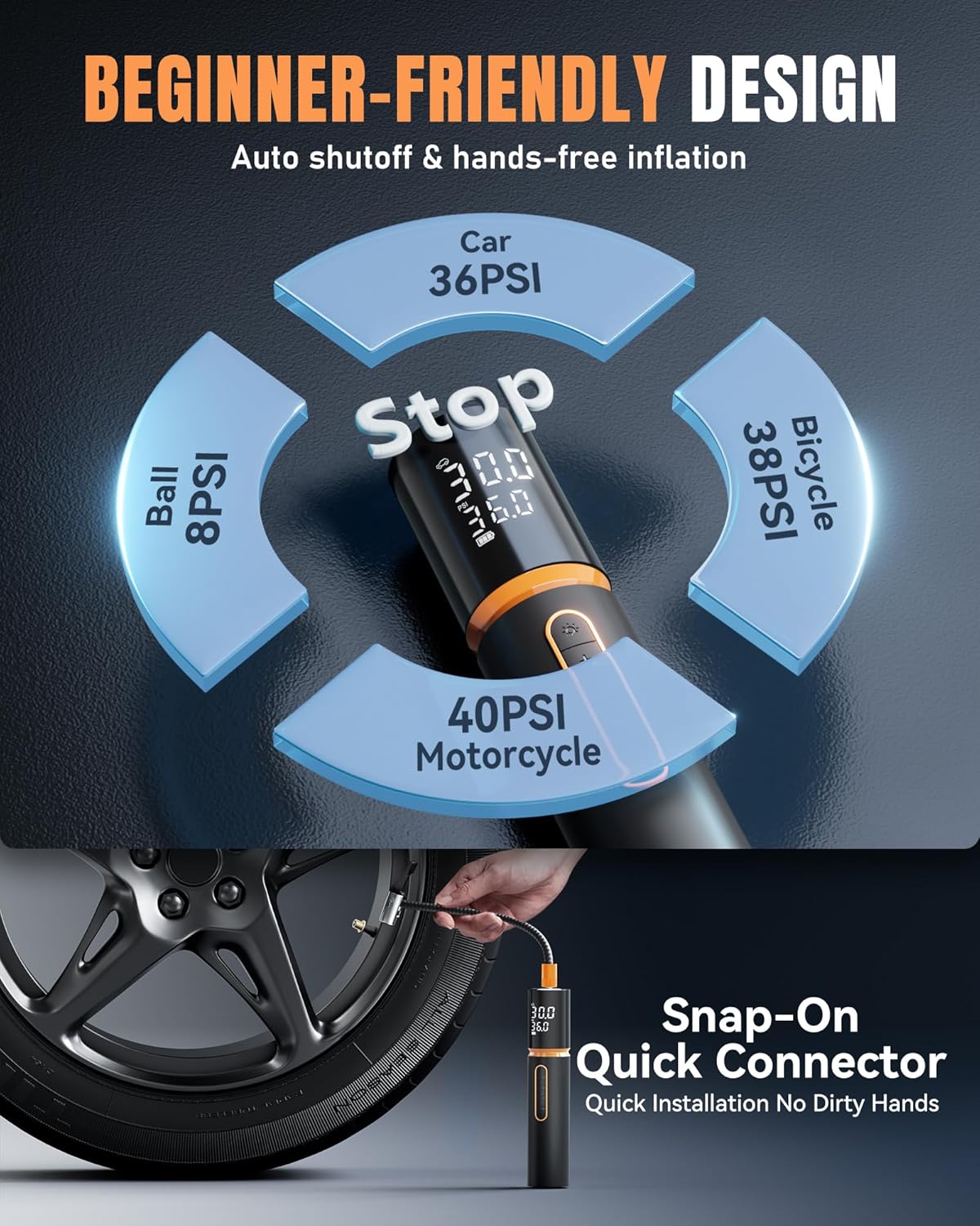 Dual Screen & Multi-Accessories: The Portable Tire Inflator has a dual Dual Screen to display preset tire pressure and real-time tire pressure. The Tire Pump provides four pressure units: PSI, BAR, KPA, KG/c㎡. Also includes a Presta Valve, a Needle Connector, 2 General Connector, and a Schrader Valve. Use with cars, motorcycles, electric bikes, bicycles, balls, and more.