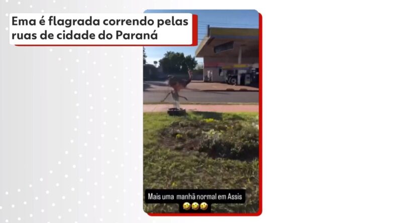 Uma ema foi vista correndo pelas ruas de Assis Chateaubriand, no oeste do Paraná, na manhã desta quinta-feira (18). Assista ao vídeo acima.